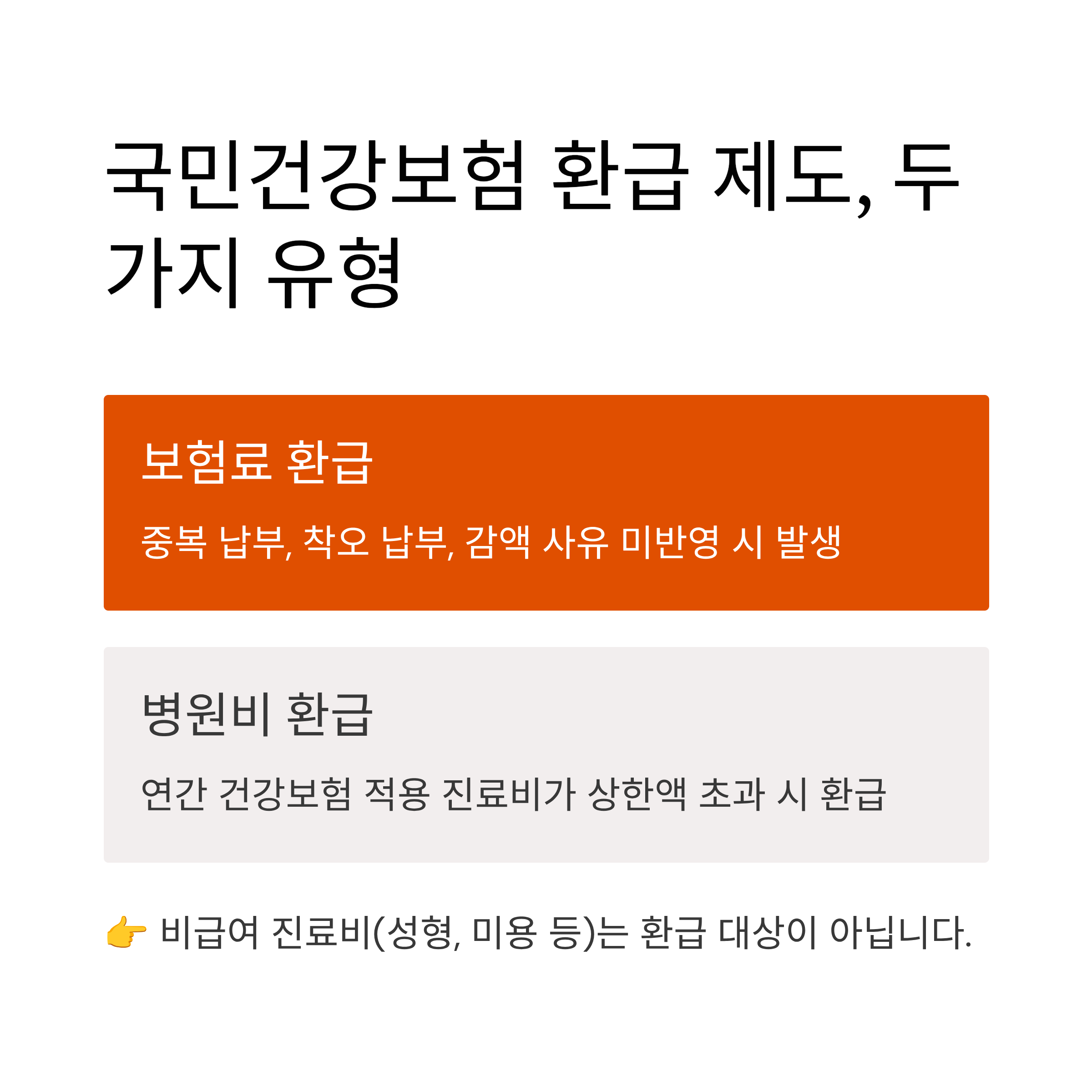 - 병원비 환급(본인부담금 상한제): 연간 건강보험 적용 진료비가 상한액을 초과할 경우 초과분 환급