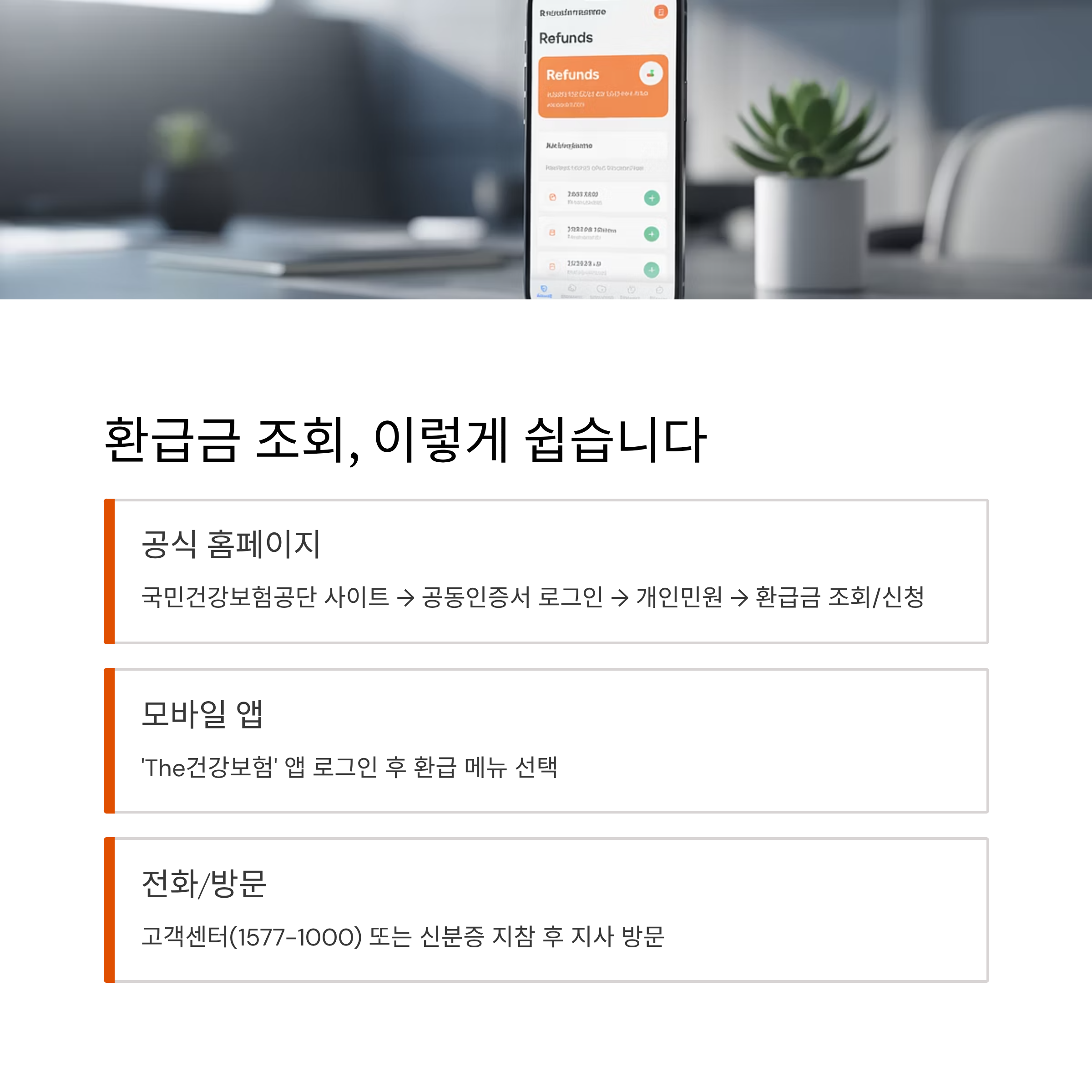 - 공식 홈페이지: 국민건강보험공단 사이트 → 공동인증서 로그인 → 개인민원 → 환급금 조회/신청