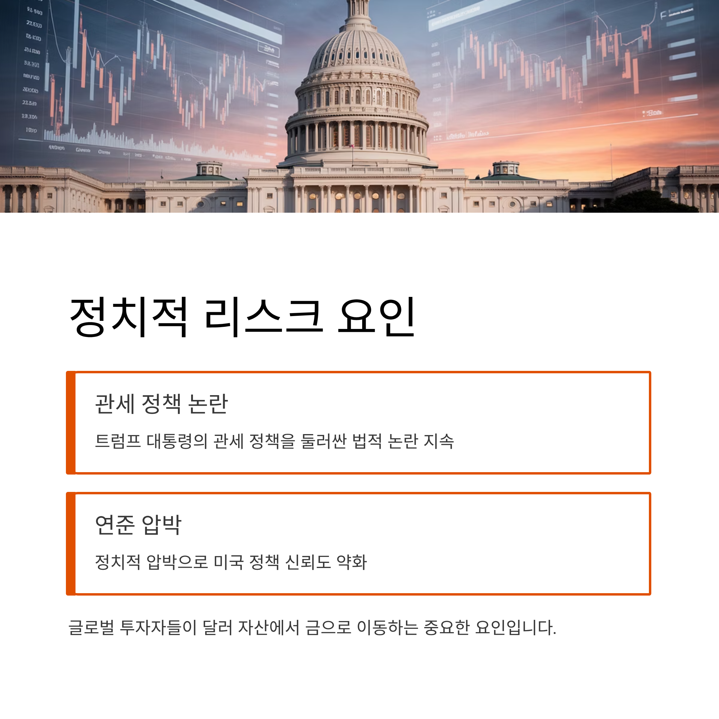 트럼프 대통령의 관세 정책을 둘러싼 법적 논란과 연준에 대한 정치적 압박은 미국 정책 신뢰도를 약화시키고 있습니다. 이는 글로벌 투자자들이 달러 자산에서 금으로 이동하게 만드는 중요한 요인으로 꼽힙니다.