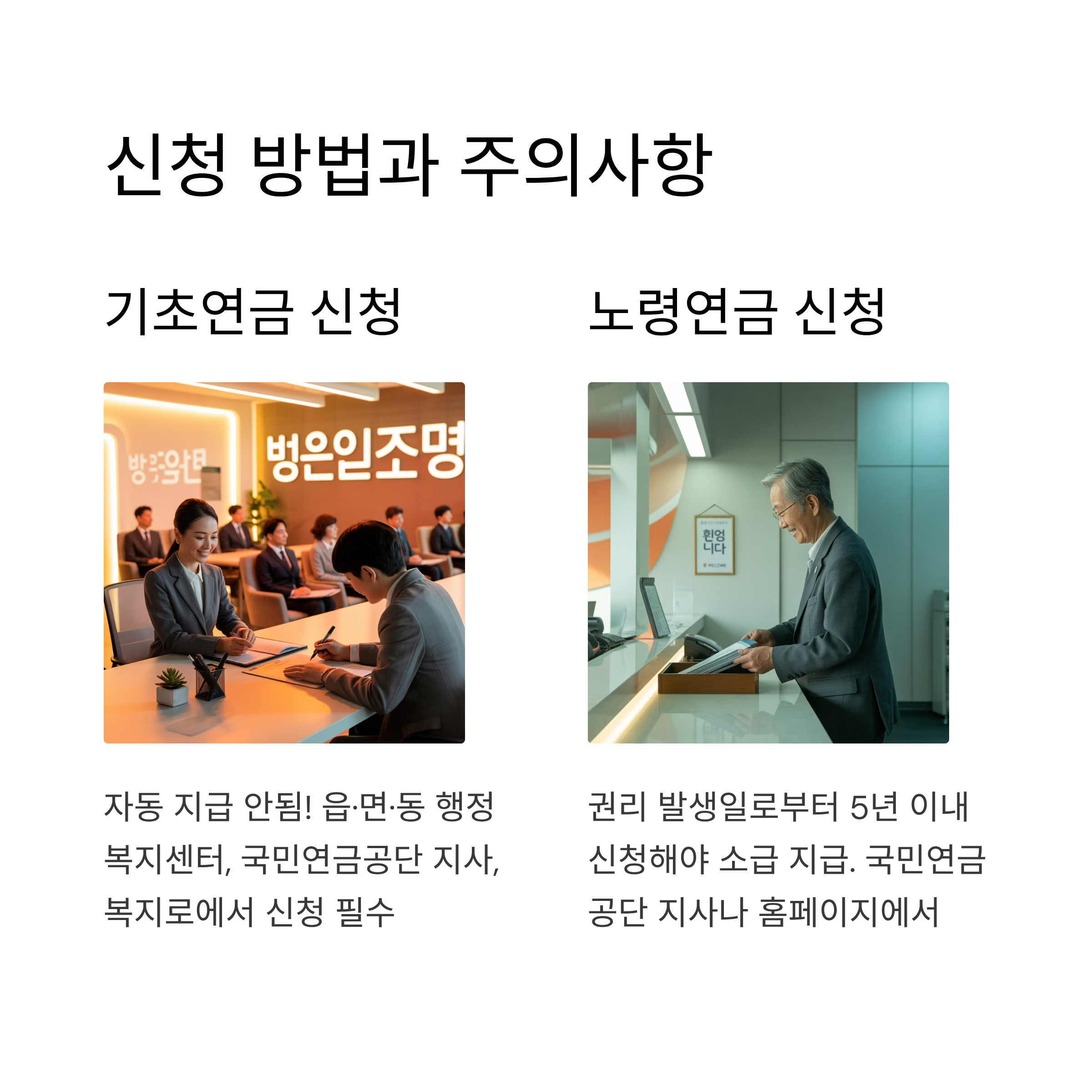 | 신청 | 주민센터·복지로·국민연금공단 | 국민연금공단·홈페이지·우편 |