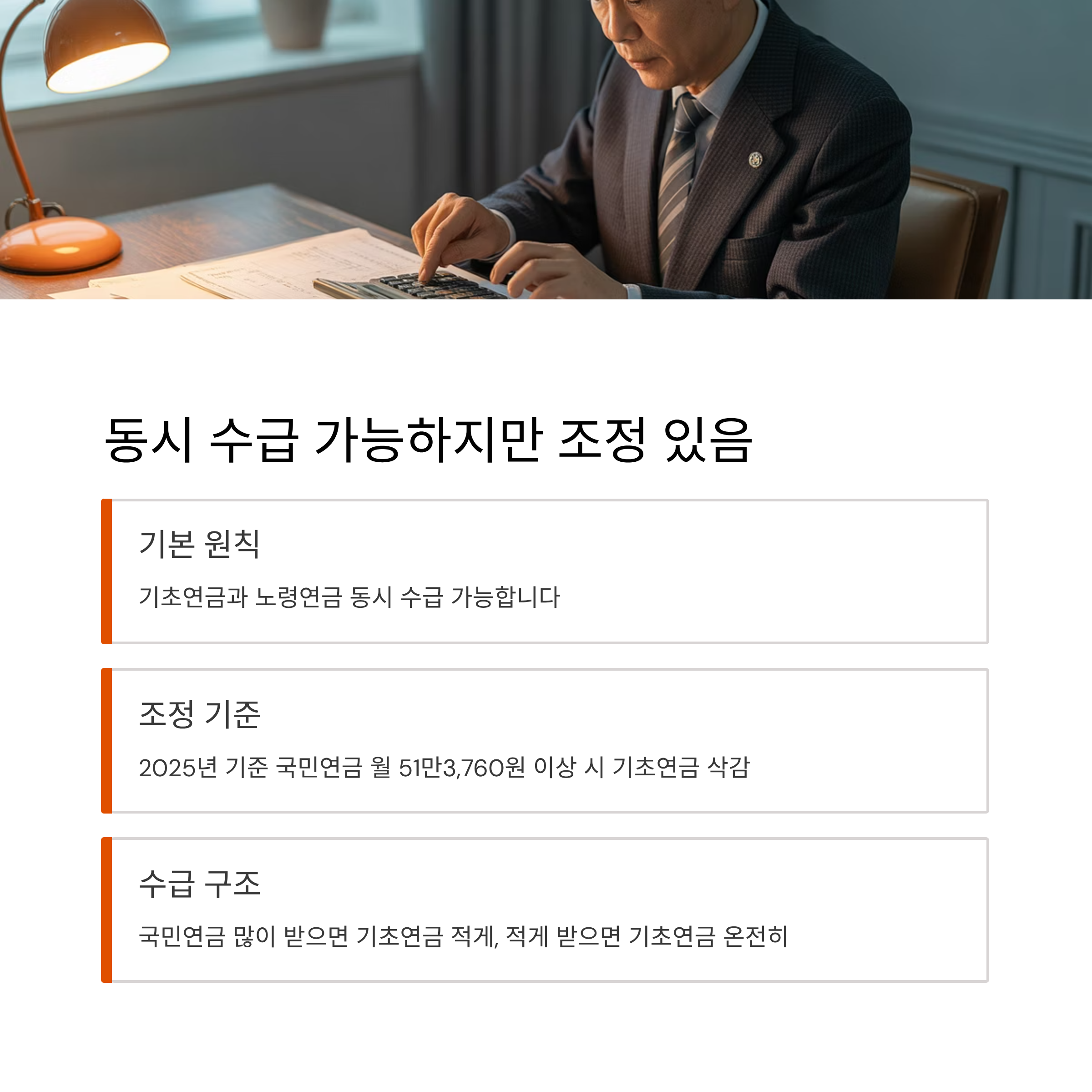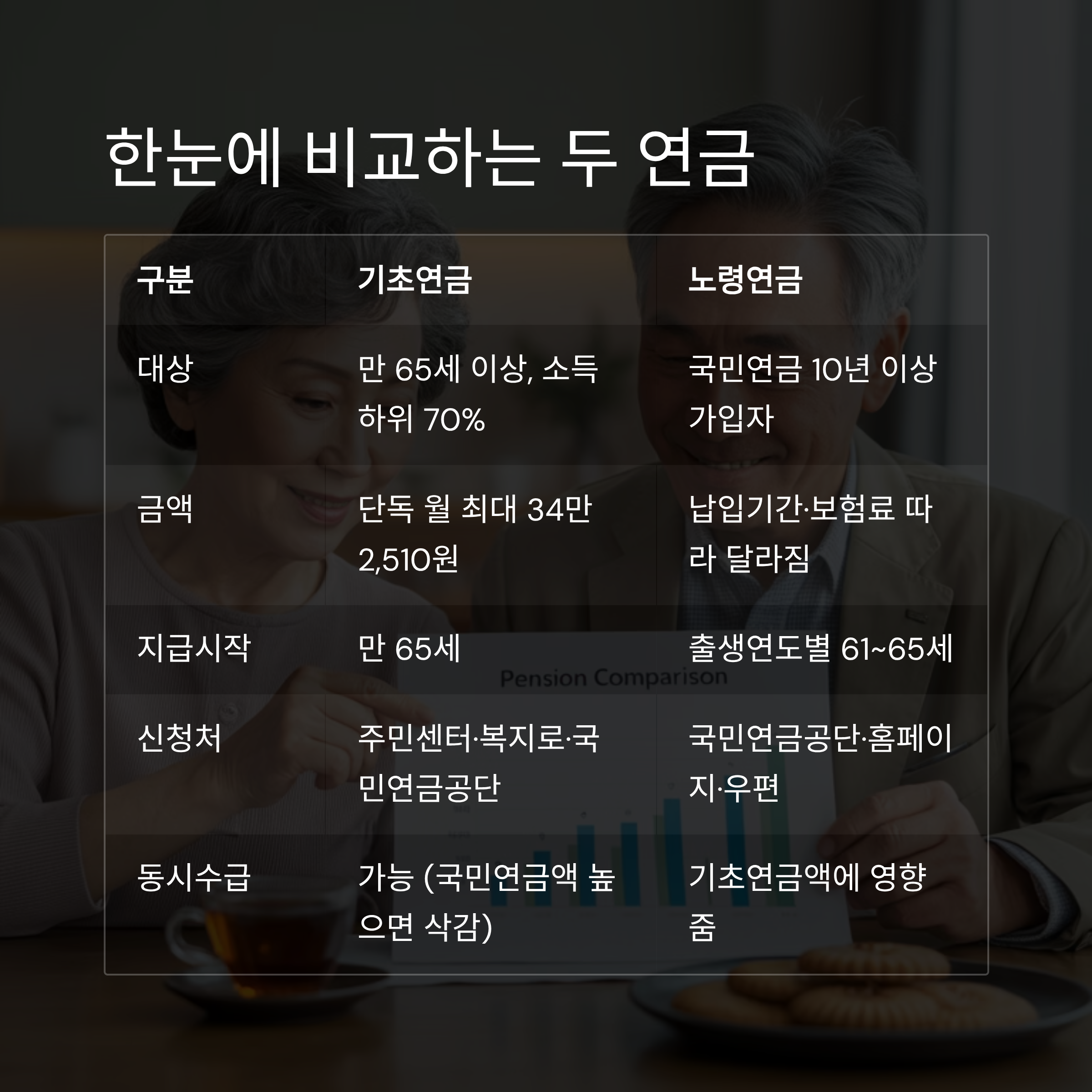 | 동시 수급 | 가능 (국민연금액 높으면 삭감) | 기초연금액에 영향 줌 |