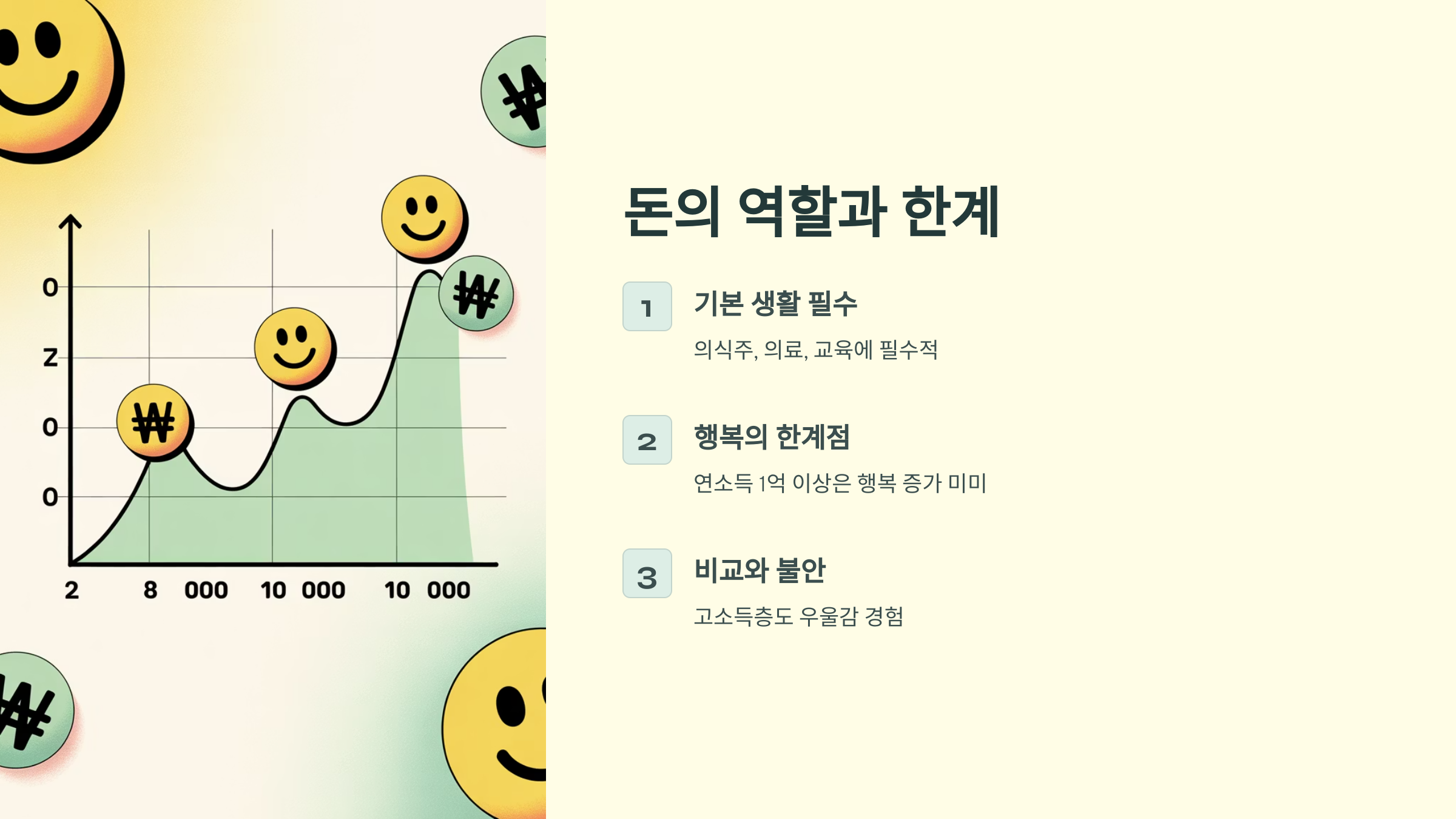 그런데 돈이 많아질수록 행복도 비례해서 늘어날까요? 이에 대한 심리학 연구 결과는 다소 복잡합니다. 미국 프린스턴대학교의 연구에 따르면, 연소득 7만 5천 달러(한화 약 1억 원) 정도까지는 소득이 높아질수록 행복감도 커졌지만, 그 이상에서는 더 많은 돈이 행복에 유의미한 차이를 만들지 않는다고 합니다. 실제로 고소득층임에도 불안이나 우울을 호소하는 사람들이 많은 이유도 여기에 있습니다. 핵심은, 일정 수준 이상의 돈은 행복보다 '비교'와 '불안'의 원인이 되기도 한다는 점입니다.