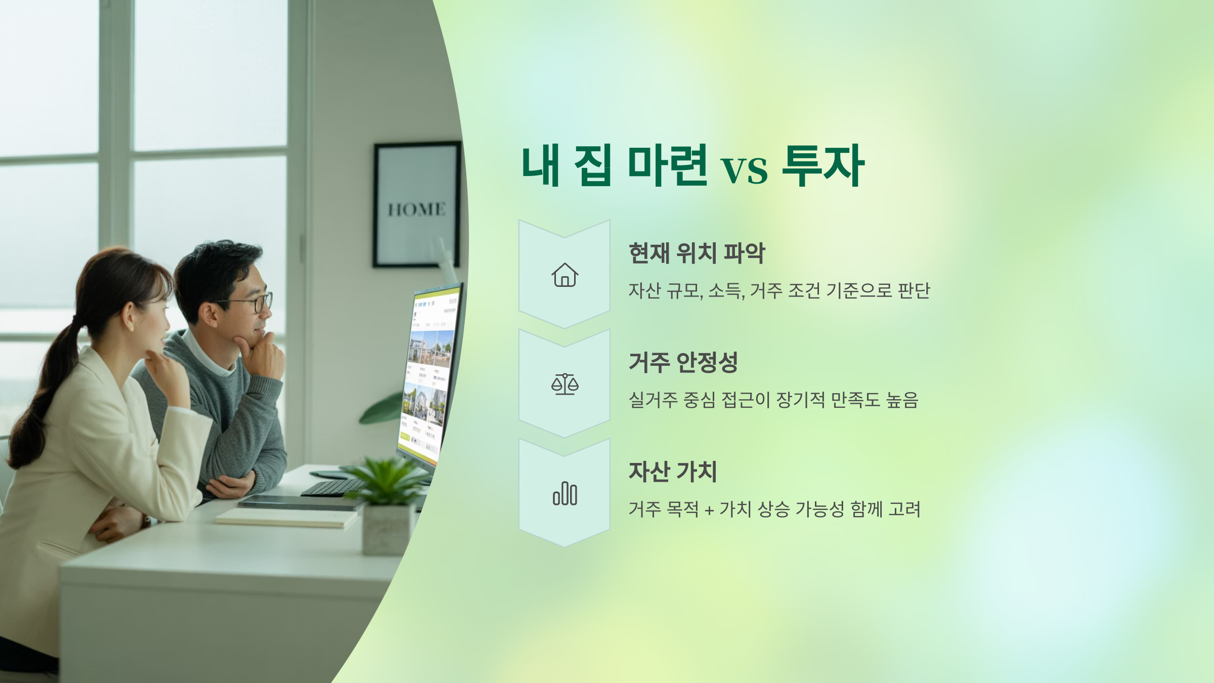 많은 분들이 부동산에 관심은 있지만, ‘내 집 마련부터 할지, 투자로 시작할지’ 고민을 많이 합니다. 마케팅 전략을 수립할 때도 고객의 현재 위치를 파악하는 게 첫 번째이듯, 부동산도 현재 자산 규모, 소득, 거주 조건 등을 기준으로 판단해야 합니다.