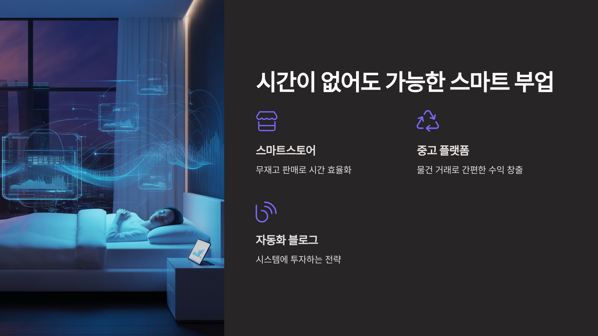 많은 직장인들이 부업을 망설이는 이유는 ‘시간이 없다’는 점입니다. 그런데 요즘은 기술 덕분에 시간을 효율적으로 쓸 수 있는 부업 형태가 늘어나고 있습니다. 예를 들어, 스마트스토어 무재고 판매, 중고 플랫폼을 통한 물건 거래, 자동화된 블로그 수익화 등이 대표적입니다.