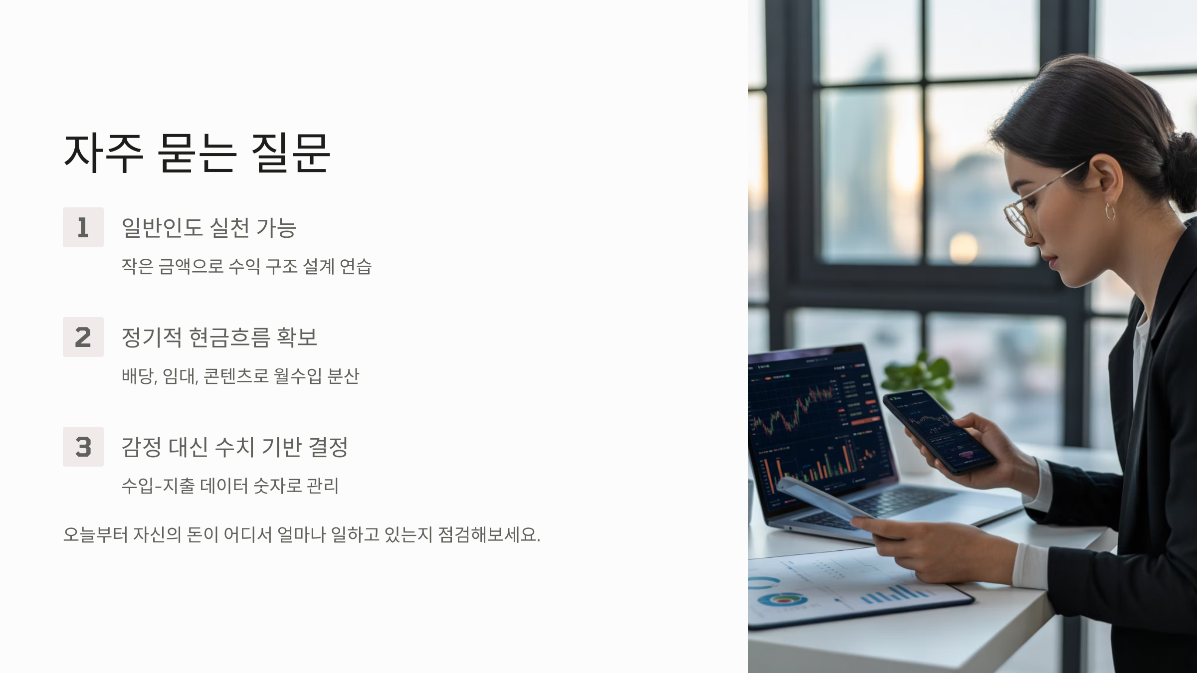 A. 정기적인 현금 흐름 확보를 중시하는 습관입니다. 배당, 임대, 콘텐츠 수익 등으로 월수입을 분산합니다.