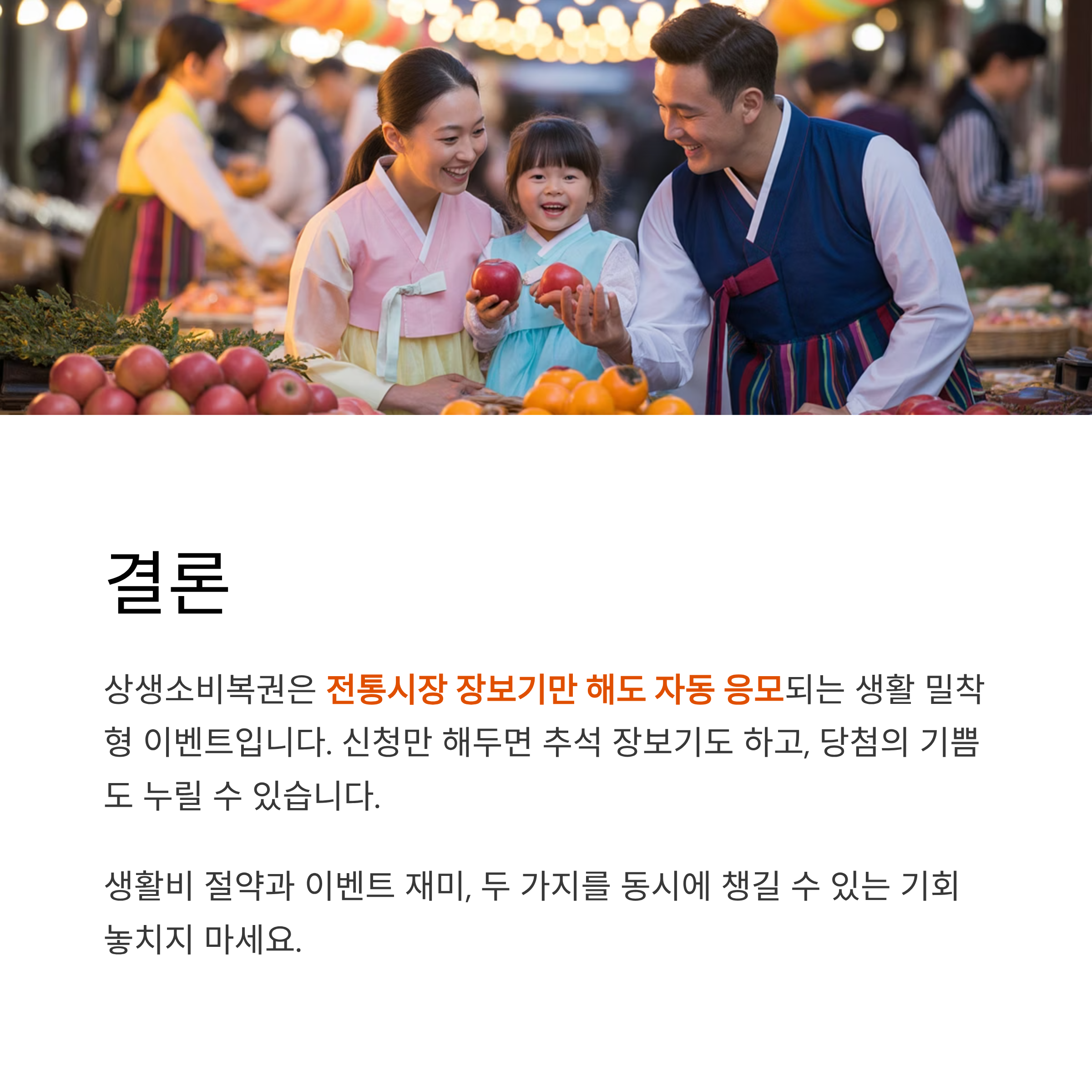 상생소비복권은 전통시장 장보기만 해도 자동 응모되는 생활 밀착형 이벤트입니다. 신청만 해두면 추석 장보기도 하고, 당첨의 기쁨도 누릴 수 있습니다. 생활비 절약과 이벤트 재미, 두 가지를 동시에 챙길 수 있는 기회 놓치지 마세요.
