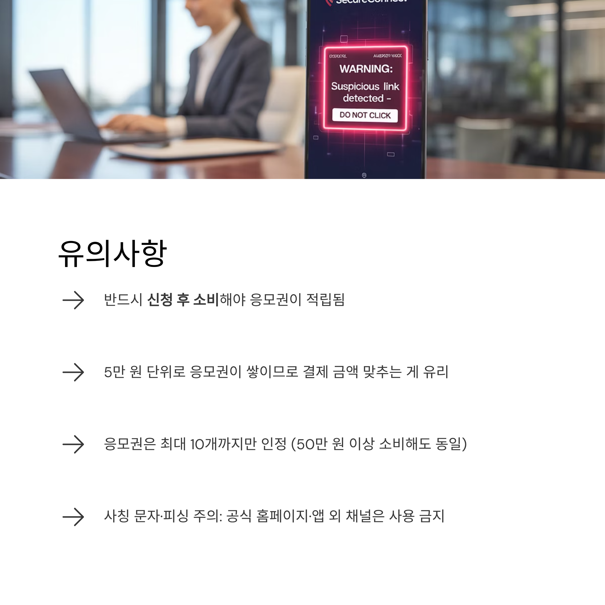 - 사칭 문자·피싱 주의: 공식 홈페이지·앱 외 채널은 사용 금지