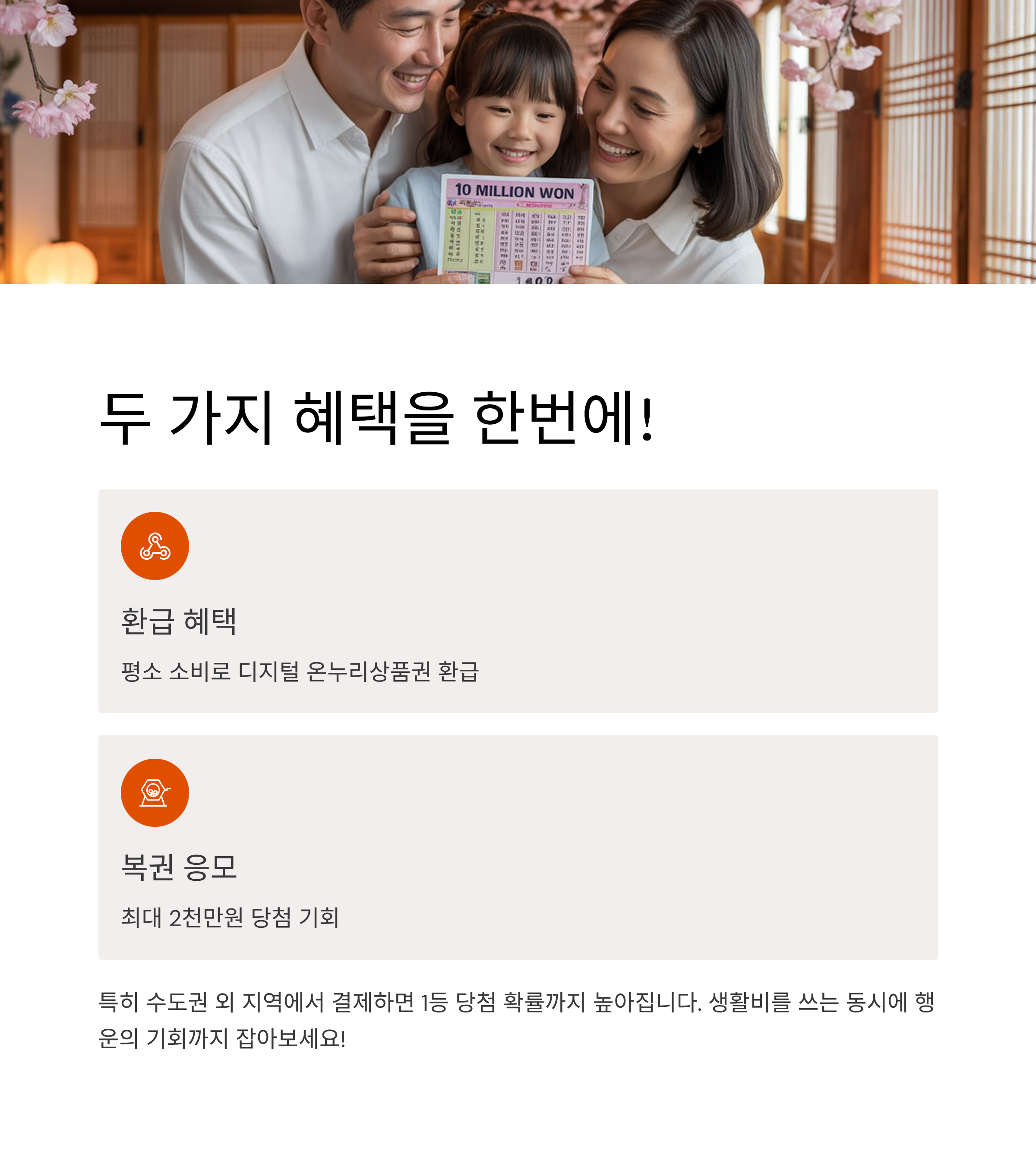 상생소비복권은 평소 소비만 해도 환급과 복권 응모라는 ‘두 가지 혜택’을 챙길 수 있는 제도입니다. 특히 수도권 외 지역에서 결제하면 1등 당첨 확률까지 높아지니, 생활비를 쓰는 동시에 행운의 기회까지 잡아보시길 추천드립니다.