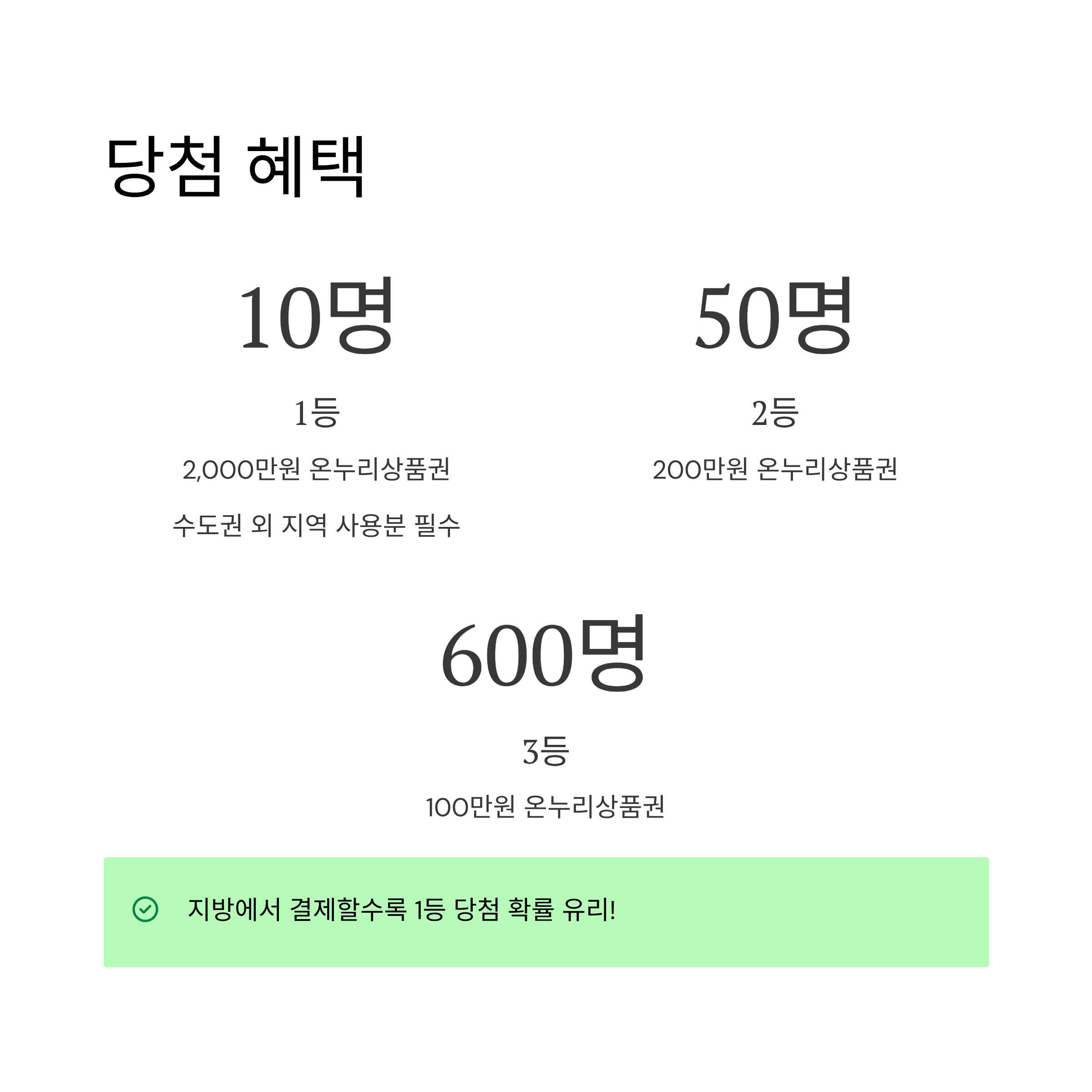 - 1등(10명): 2,000만원 온누리상품권 (수도권 외 지역 사용분 필수)