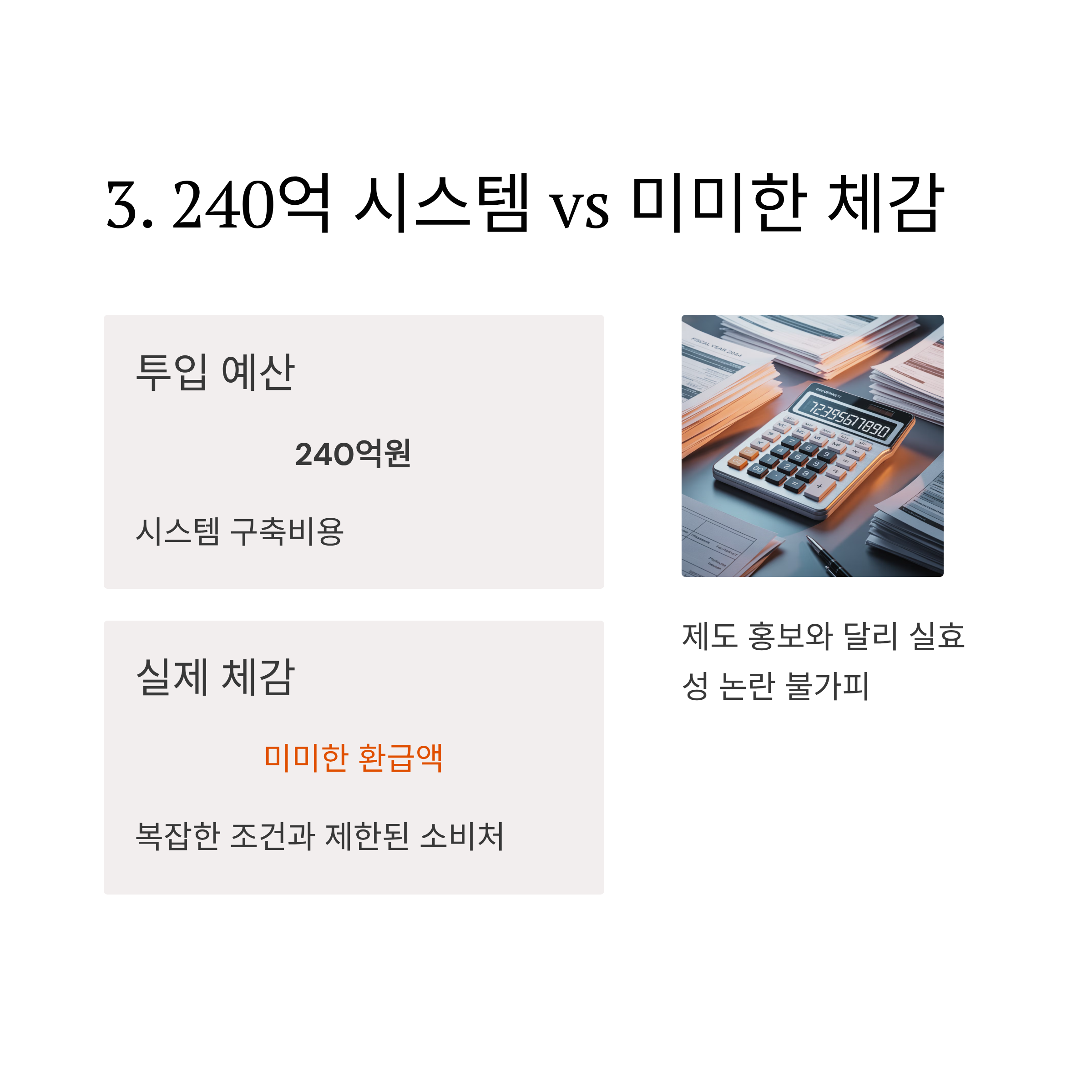 이번 제도를 위해 투입된 예산이 무려 240억 원입니다. 하지만 복잡한 조건과 제한된 소비처 탓에 국민이 실제로 체감하는 환급액은 미미하다는 지적이 많습니다. 제도 홍보와 달리 실효성 논란이 불가피한 이유죠.