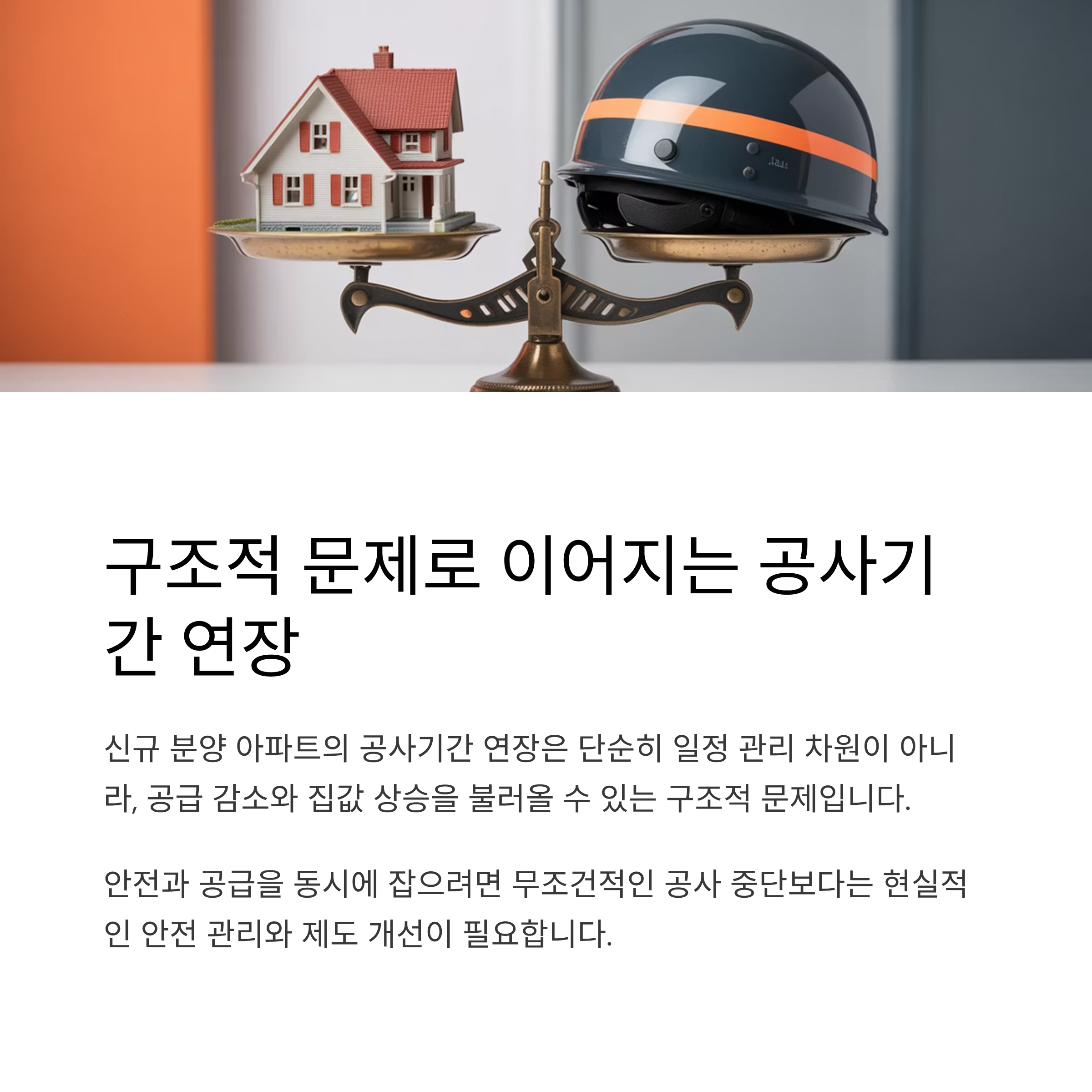 신규 분양 아파트의 공사기간 연장은 단순히 일정 관리 차원이 아니라, 공급 감소와 집값 상승을 불러올 수 있는 구조적 문제입니다. 안전과 공급을 동시에 잡으려면 무조건적인 공사 중단보다는 현실적인 안전 관리와 제도 개선이 필요합니다.