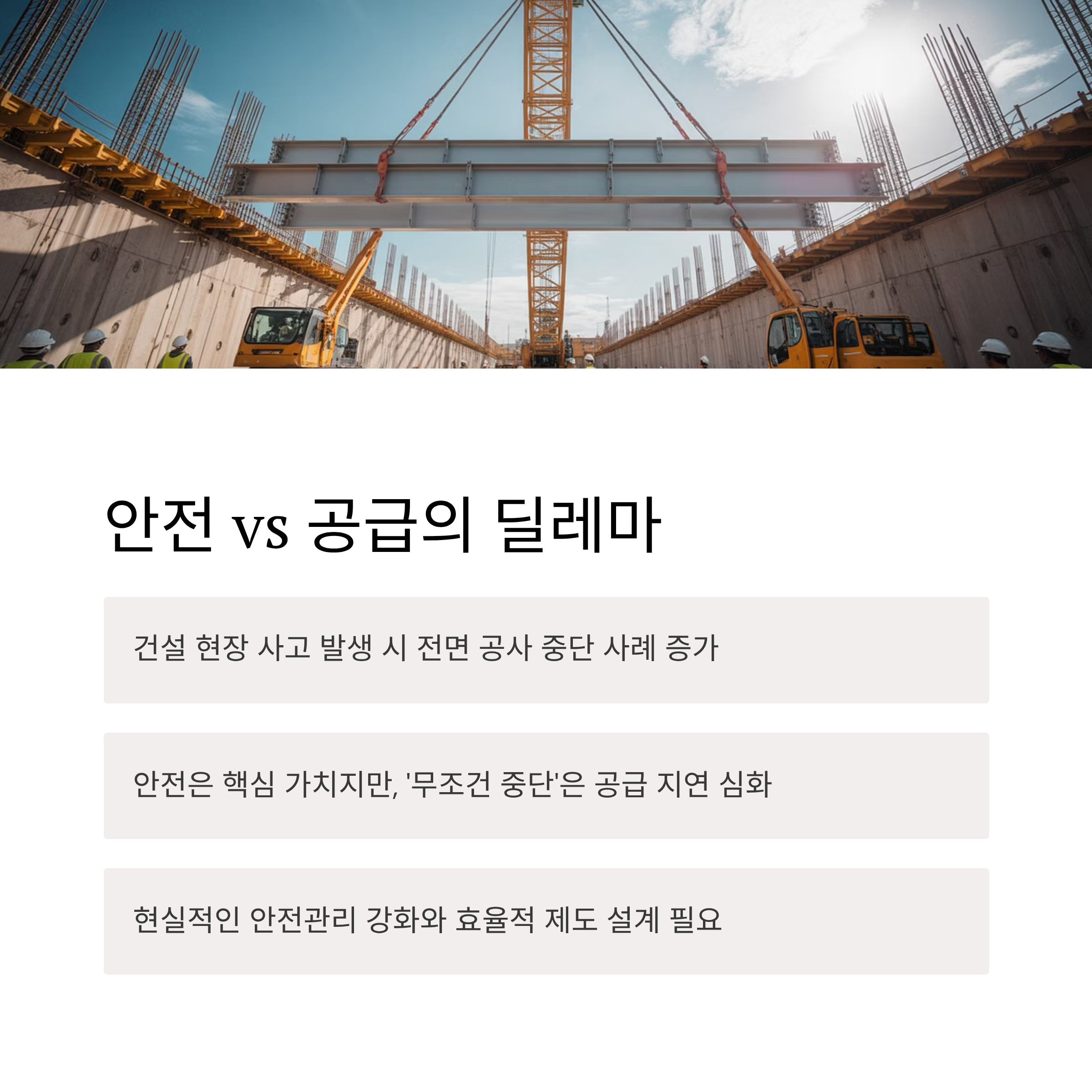 - 최근 건설 현장 사고 발생 시 전면 공사 중단 사례 증가