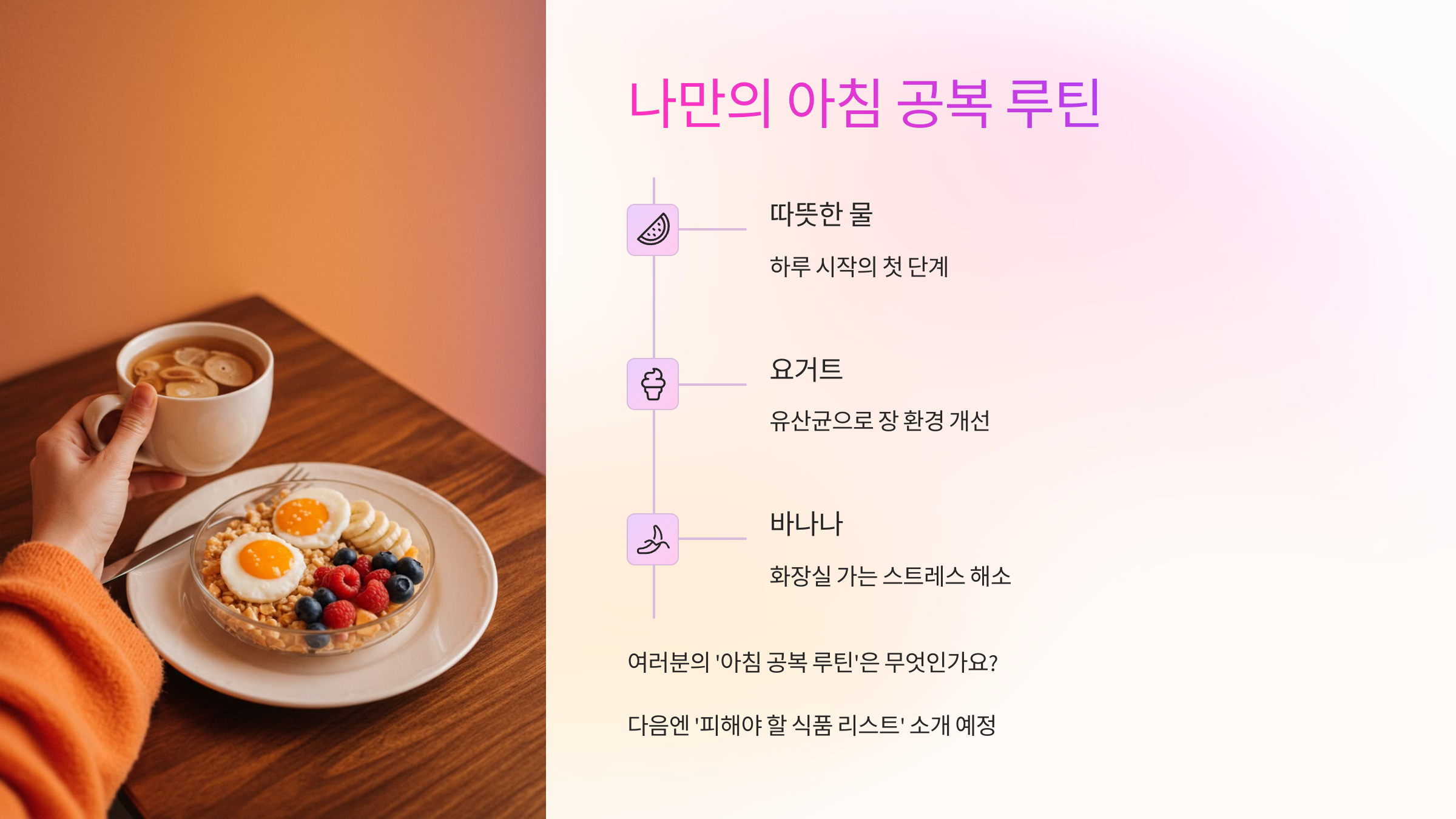 다음엔 ‘아침 공복에 피해야 할 식품 리스트’도 소개해드릴게요! 기대해주세요 🛑