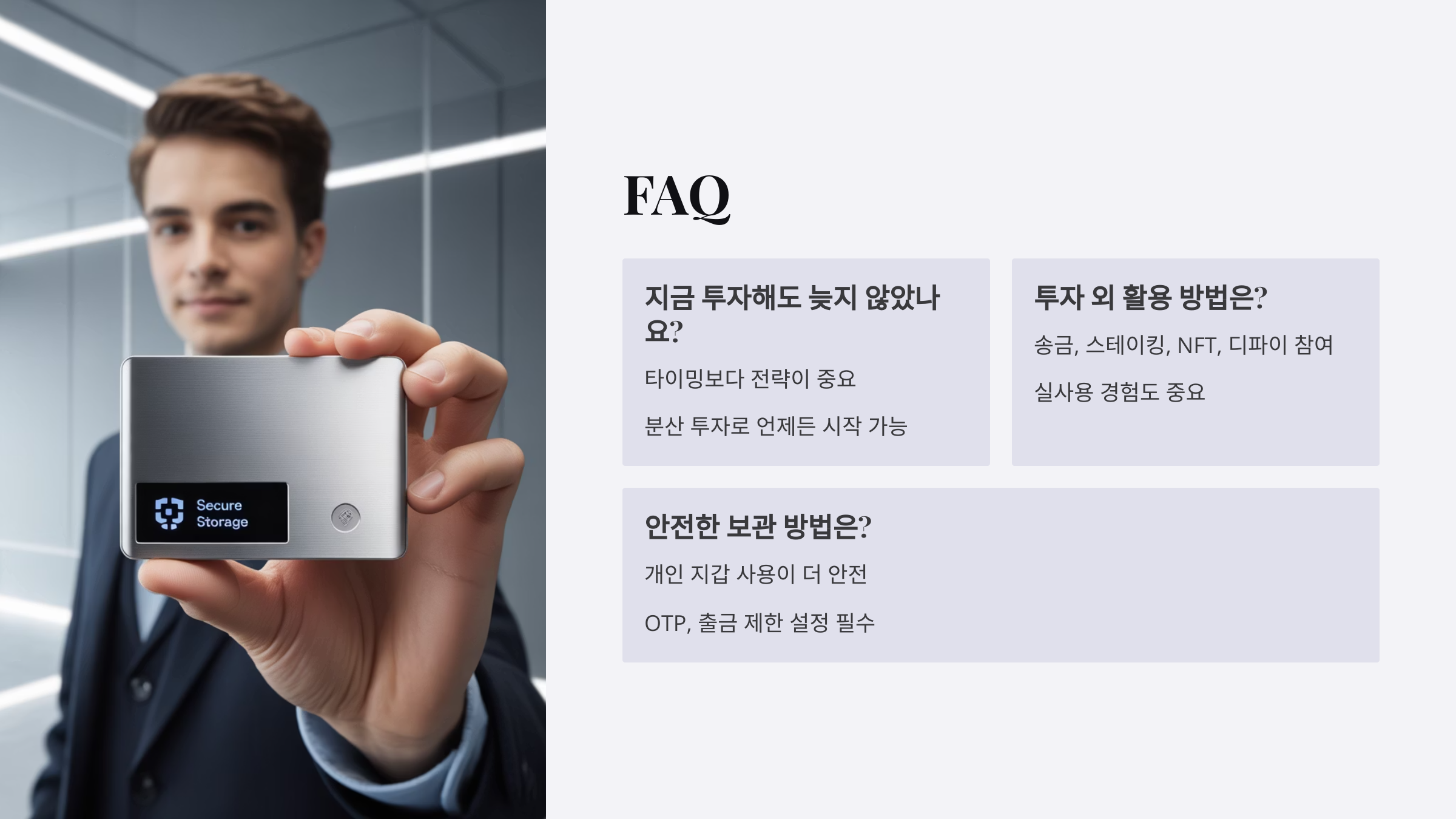 거래소에 두는 것보다 개인 지갑(하드웨어 지갑, 모바일 지갑)을 사용하는 것이 더 안전합니다. OTP, 출금 제한, 이메일 알림 등 보안 설정도 필수입니다.