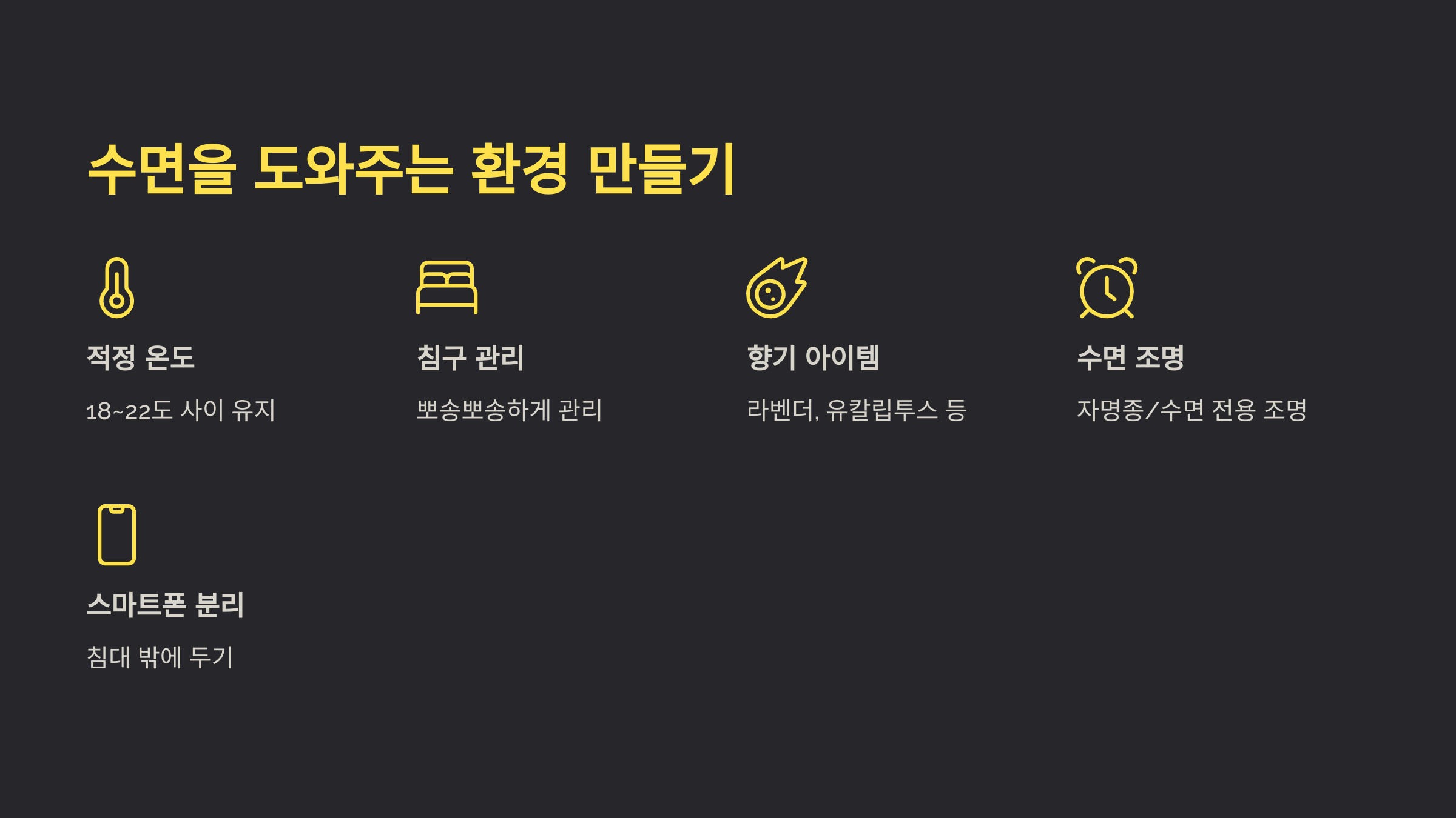 태그: 수면루틴, 불면증해결, 꿀잠팁, 잠잘오는법, 수면환경, 스트레스해소, 숙면가이드, 건강습관, 잠자는법, 수면습관
