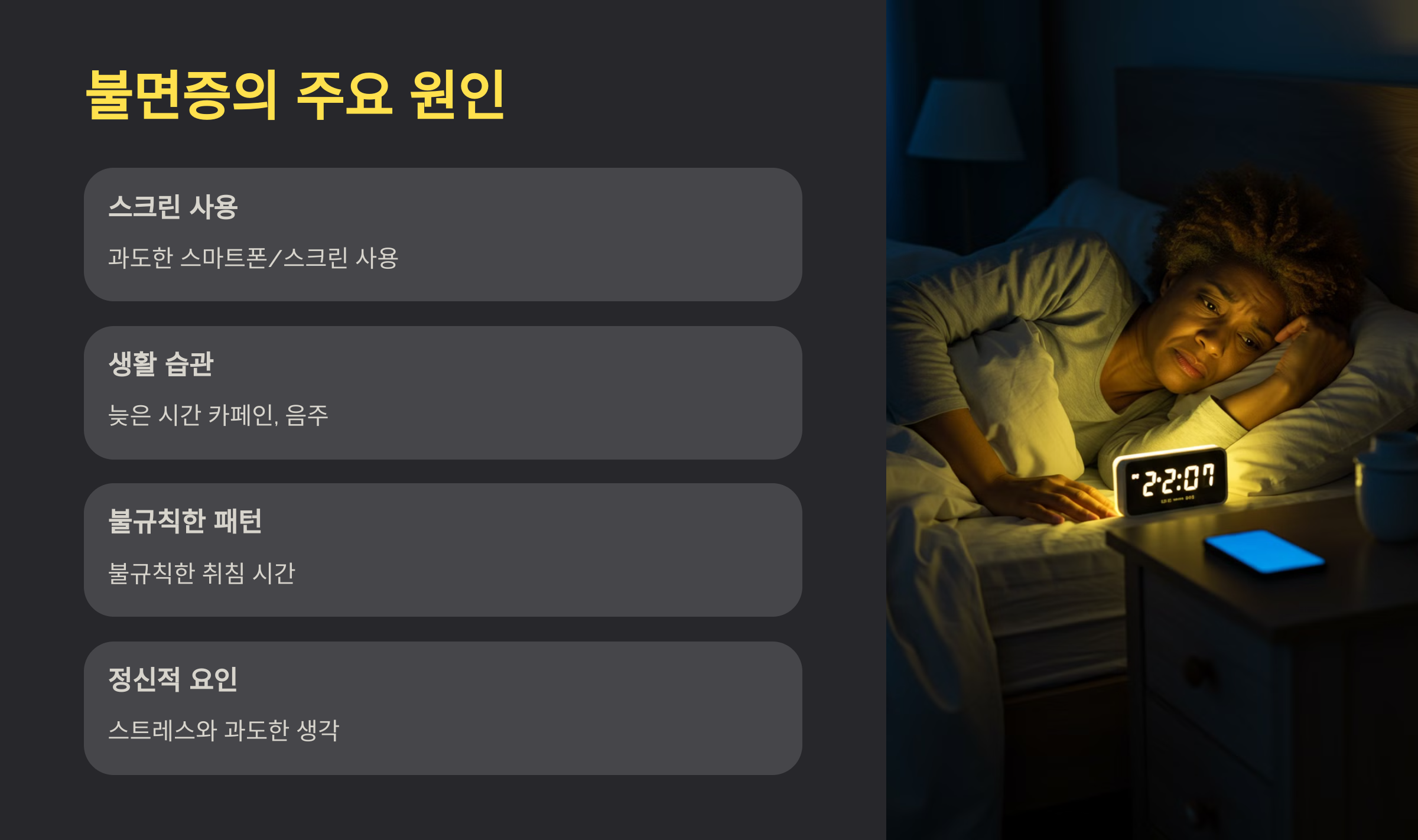 불면의 원인을 알아야 해결도 가능하겠죠?
