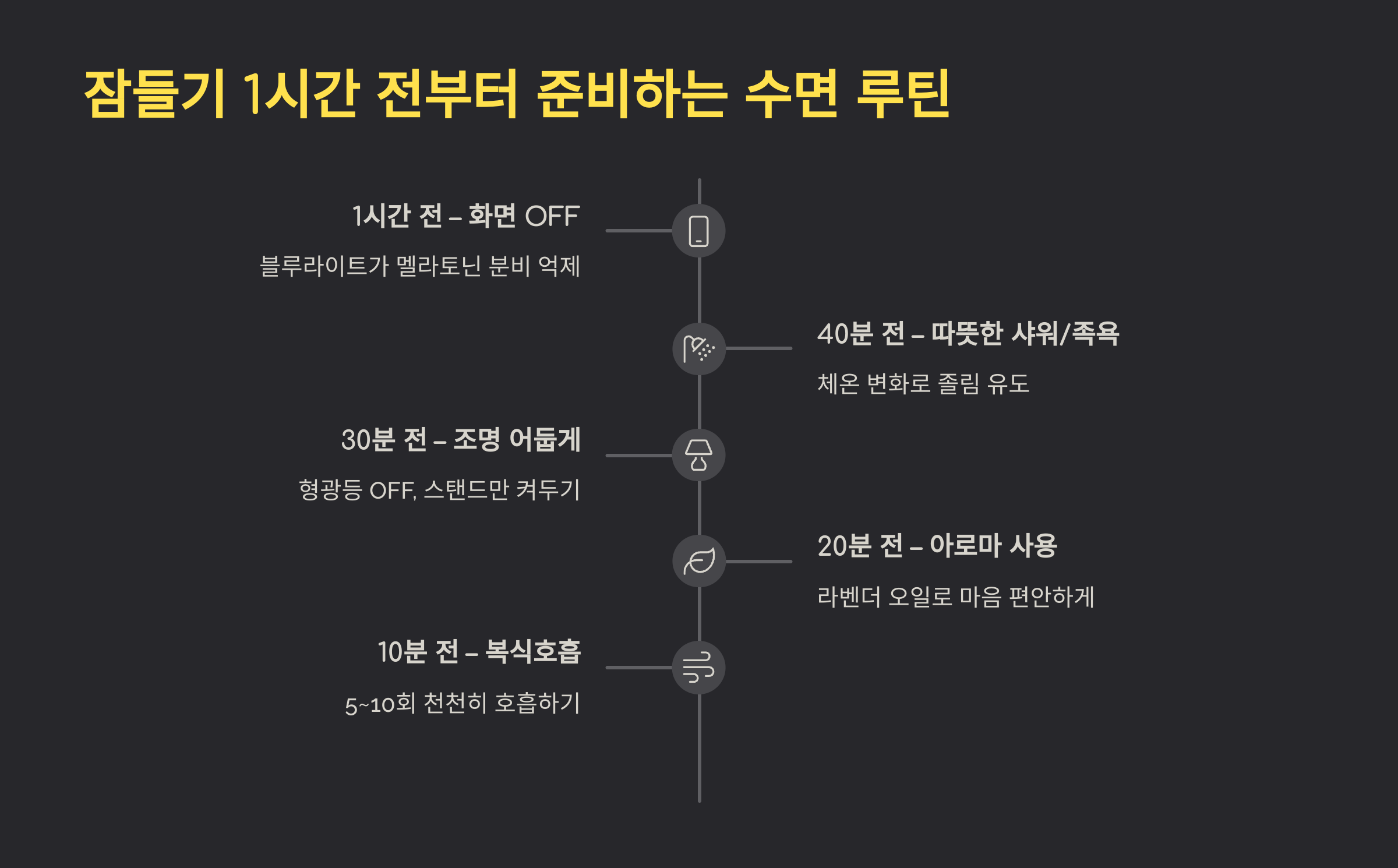 수면을 방해하는 요소를 줄이고, 몸과 마음에 ‘이제 잘 시간이야’라는 신호를 보내는 게 루틴의 핵심이에요.