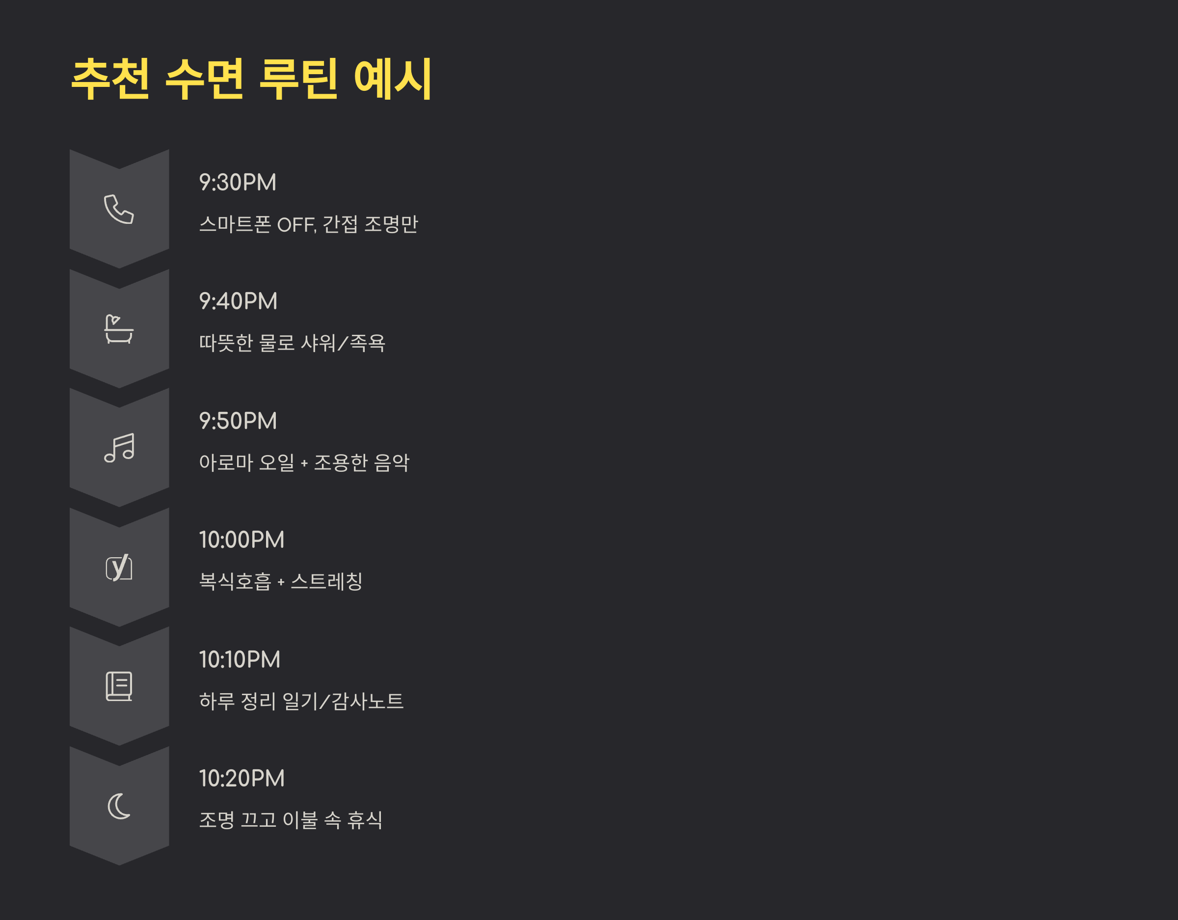 - 추천 수면 루틴 예시 (시간대별 정리)