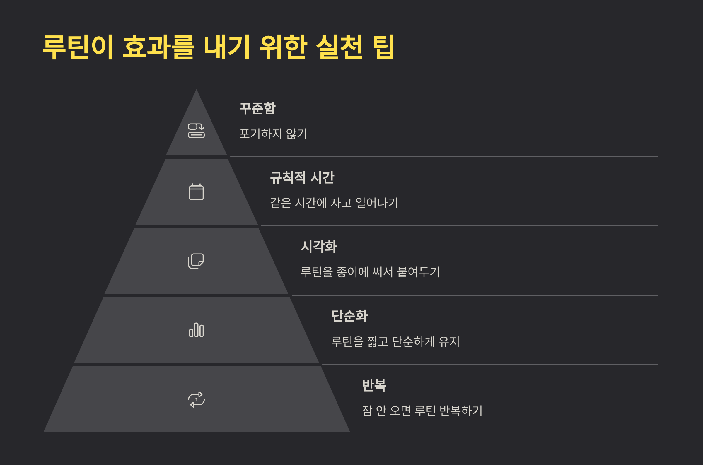 이 루틴이 반복되면 뇌가 특정 행동을 ‘수면 신호’로 인식하게 되죠.