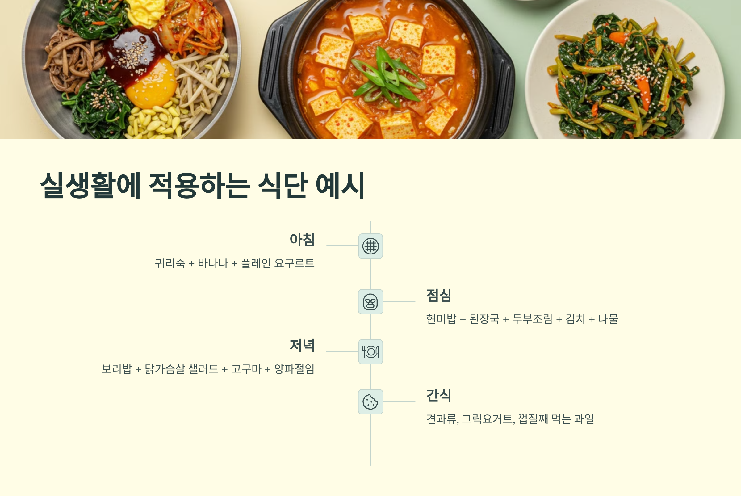 ## ## 실생활에 적용하는 식단 예시 이제 실제로 어떤 식단을 짜야 할지 고민되시죠? 예시 드릴게요! ✅ 아침 - 귀리죽 + 바나나 + 플레인 요구르트 ✅ 점심 - 현미밥 + 된장국 + 두부조림 + 김치 + 나물 반찬 ✅ 저녁 - 보리밥 + 닭가슴살 샐러드 + 고구마 + 양파절임 간식으로는 견과류나 그릭요거트, 껍질째 먹는 과일이 좋아요 🍎