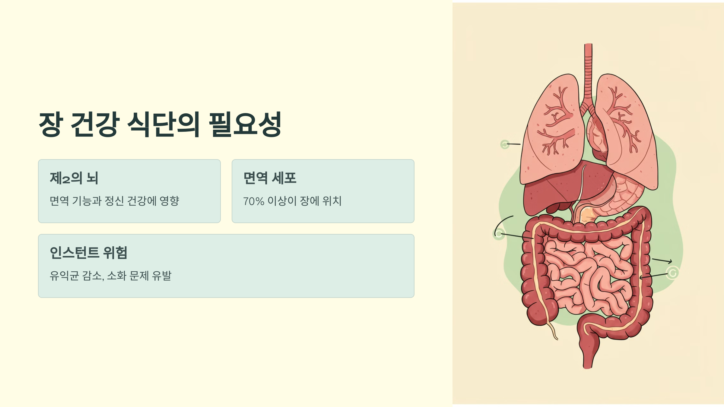## ## 장 건강 식단의 필요성 장 건강은 단순히 소화 기능만의 문제가 아니에요. 장은 '제2의 뇌'라 불릴 정도로 면역 기능과 정신 건강에까지 영향을 줍니다. 우리 몸 면역 세포의 70% 이상이 장에 있다는 연구 결과도 있어요. 그런데 매일 먹는 식단이 인스턴트 위주라면 장내 유익균이 줄어들고, 가스·복부팽만·변비·설사 등 다양한 문제가 생길 수 있죠. 따라서 장을 위한 맞춤형 식단을 꾸리는 건, 건강한 일상을 위한 첫걸음이에요.