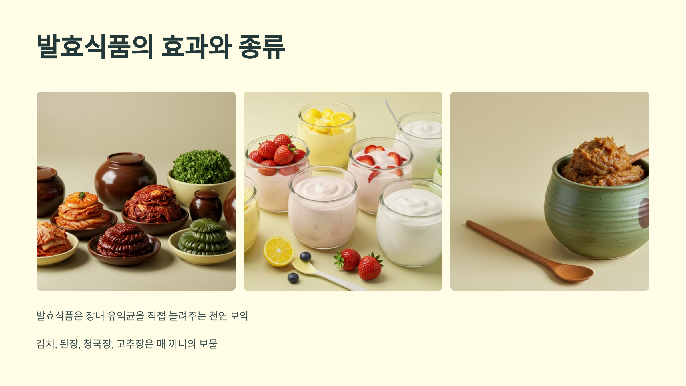 ## ## 발효식품의 효과와 종류 발효식품은 장내 유익균을 직접적으로 늘려주는 천연 보약 같은 존재입니다. 한국의 대표적인 발효식품인 김치, 된장, 청국장, 고추장은 매 끼니에 빠지지 않는 보물이에요. 특히 청국장은 바실러스균이 풍부해서 변비나 장 트러블에 정말 효과적이죠. 요구르트나 그릭요거트도 식사나 간식으로 활용하면 좋아요. 단, 당 함량은 꼭 체크해주시고요!
