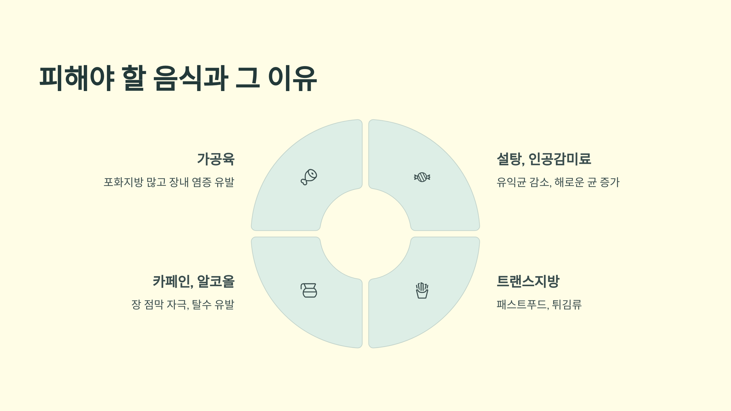 ## ## 피해야 할 음식과 그 이유 장 건강을 해치는 음식도 피해야 해요. ❌ 대표적인 해로운 음식 - 가공육, 소시지, 햄 등: 포화지방이 많고 장내 염증 유발 가능 - 설탕과 인공감미료가 든 음식: 유익균을 줄이고 해로운 균 증가 - 트랜스지방이 많은 패스트푸드, 튀김류 - 과한 카페인과 알코올: 장 점막을 자극하고 탈수를 유발 이런 음식들은 되도록 줄이고, 자연식 위주의 식사를 해야 장이 편안해져요!