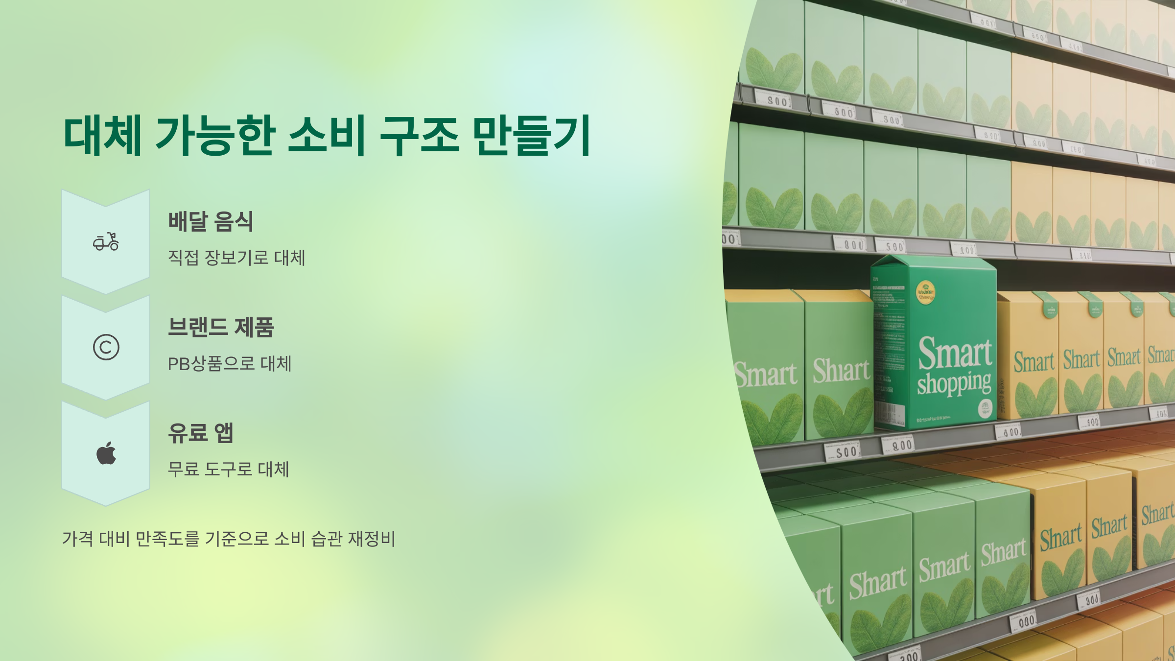 절약의 또 다른 핵심은 ‘대체재’를 찾는 것입니다. 마케팅에서 동일한 기능을 더 저렴하게 제공하는 상품이 시장을 바꾸듯, 생활에서도 저렴하면서도 품질 좋은 대안을 찾는 노력이 필요합니다. 예를 들어, 배달보다 장보기, 브랜드 제품 대신 PB상품, 유료 앱 대신 무료 도구 등을 활용해보는 거죠.