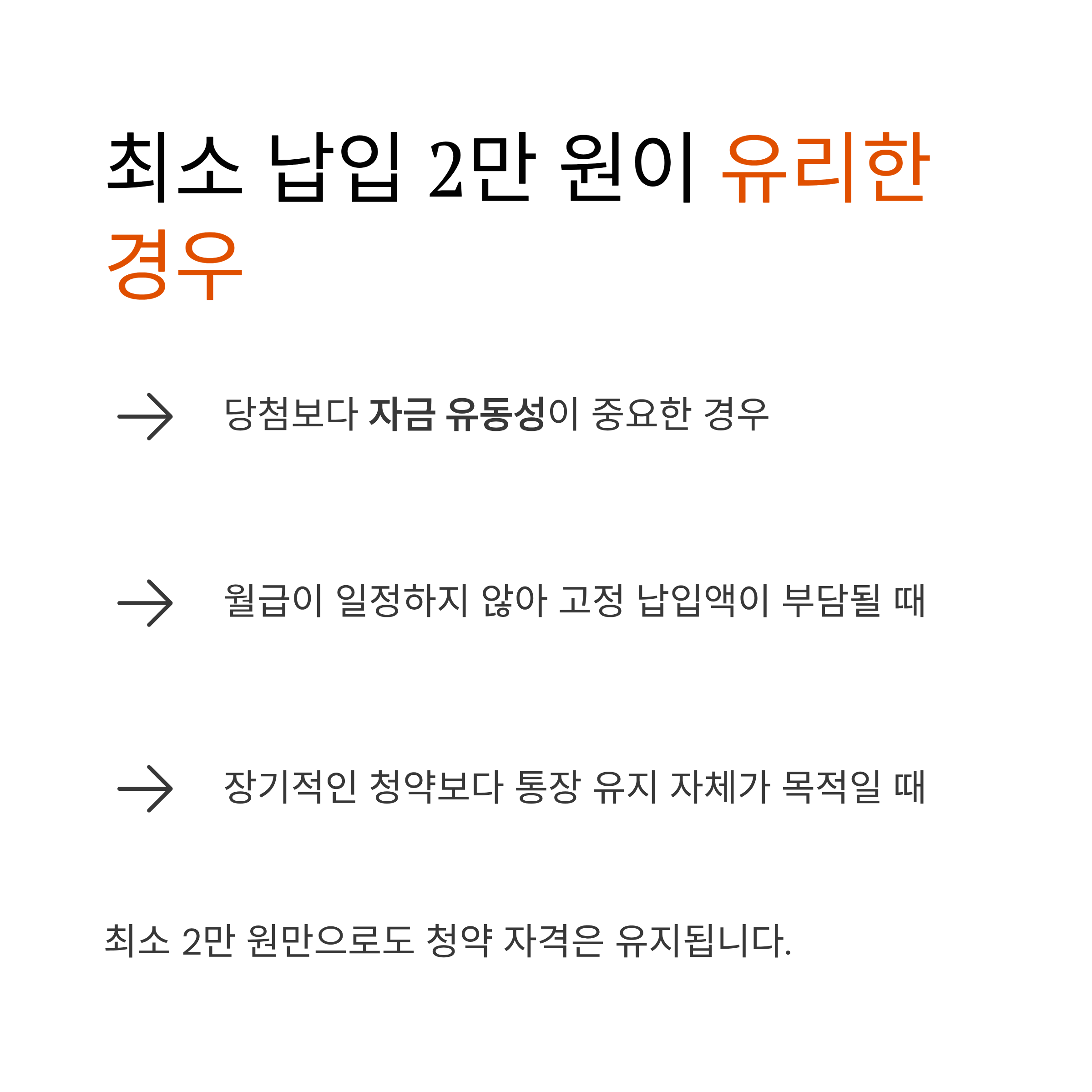 이 경우엔 최소 2만 원만 넣어도 청약 자격은 유지되므로 안정적인 자산 관리에 적합합니다.