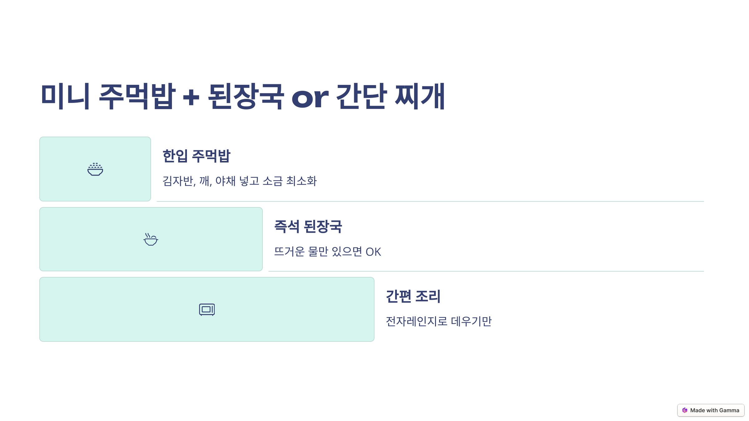 - 미니 주먹밥 + 된장국 or 간단 찌개