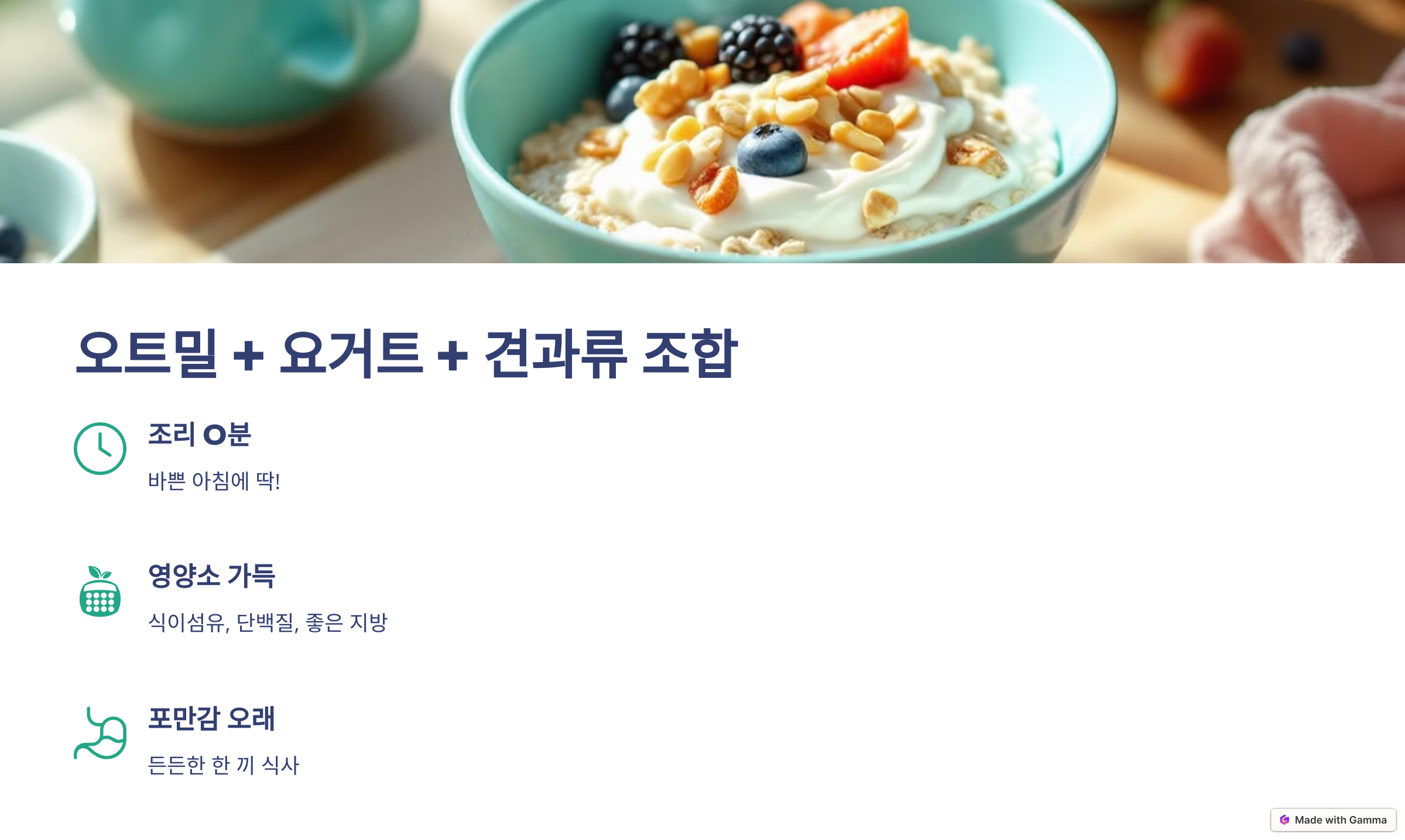 - 오트밀 + 요거트 + 견과류 조합