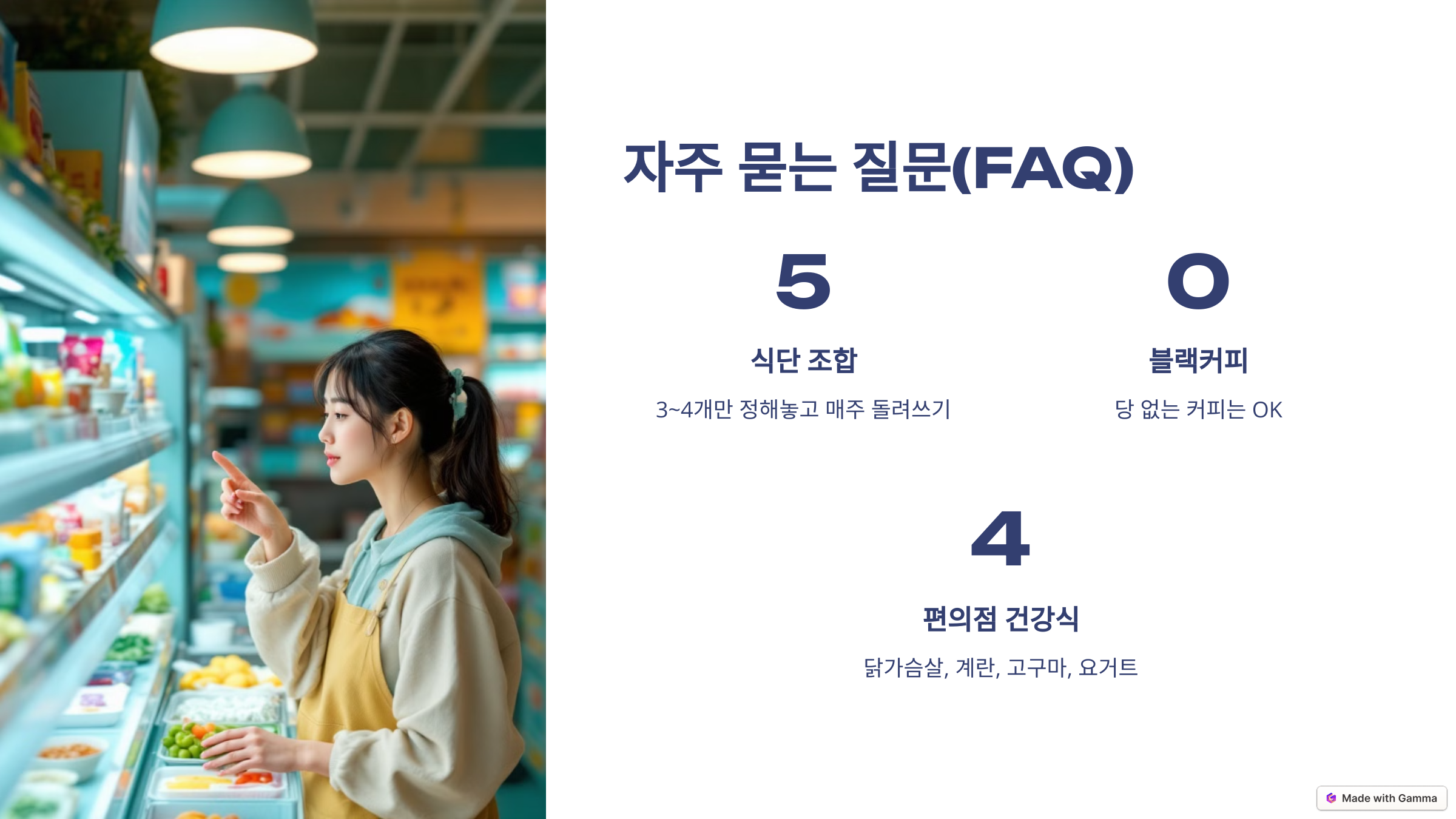A. 식단 조합을 3~4개만 정해놓고 매주 돌려쓰세요. 준비 시간을 줄이면 실천이 훨씬 쉬워져요!