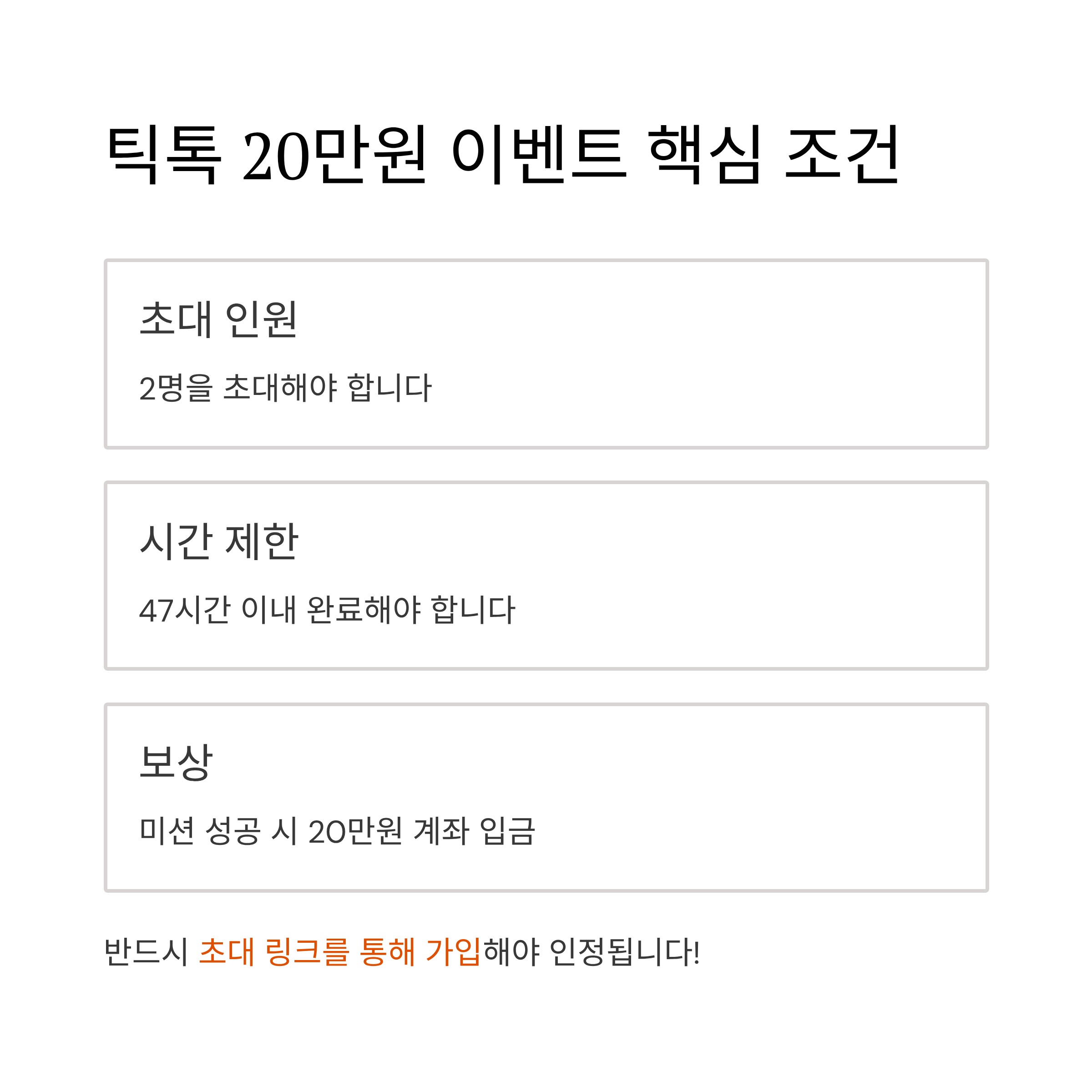 | 친구 2명 초대 | 20만원 | 초대 링크 + 47시간 내 2명 가입 | 어려움 |