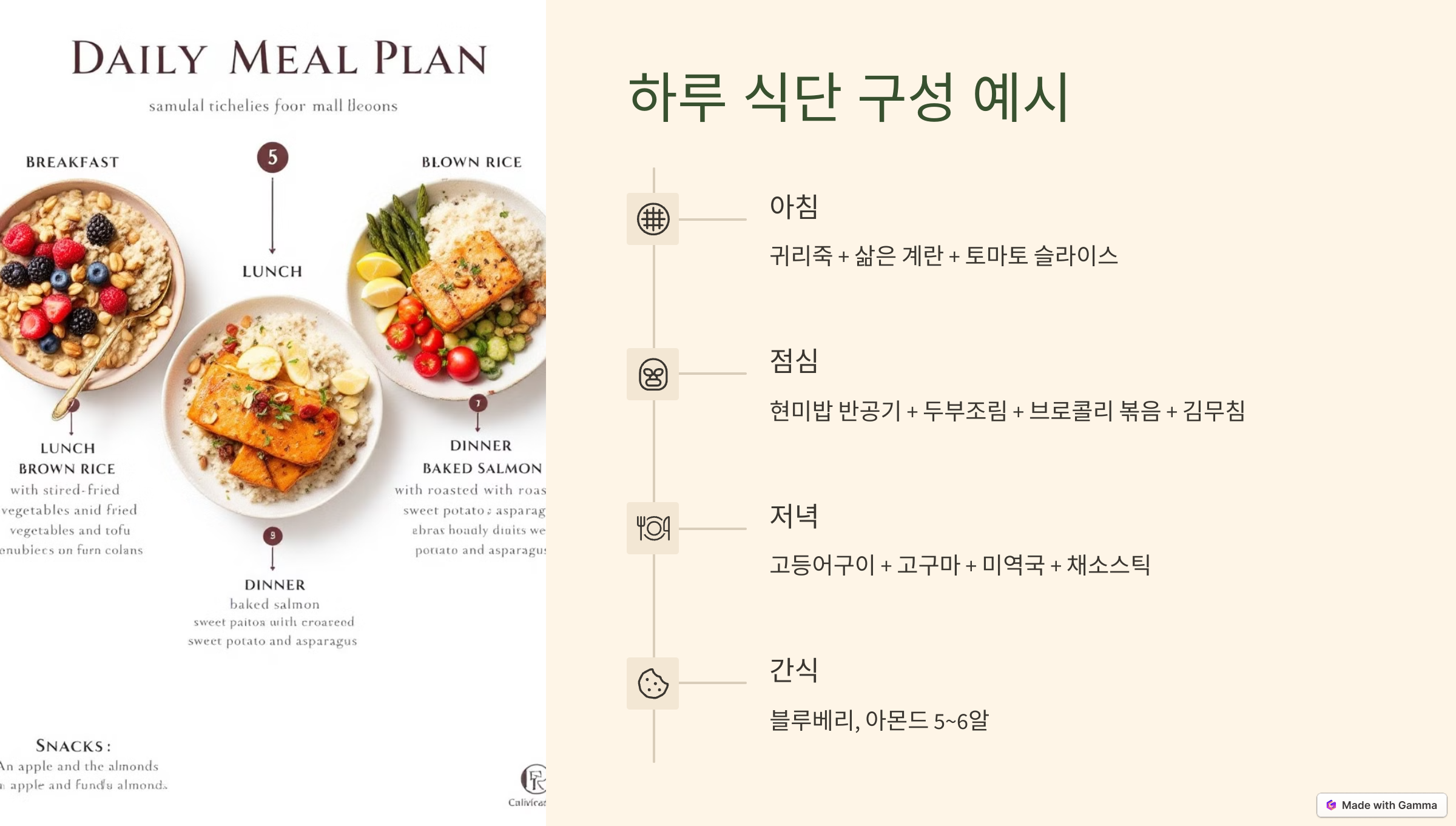 - 아침: 탄수+단백질 중심 (혈당 천천히 상승)