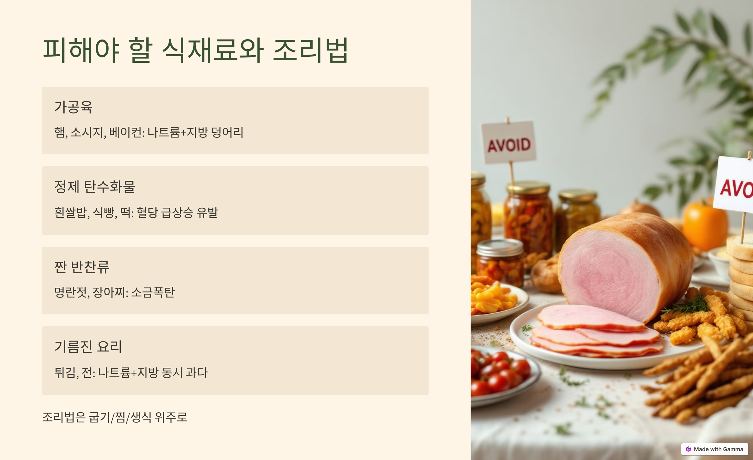 - 짠 반찬류(명란젓, 장아찌): 소금폭탄