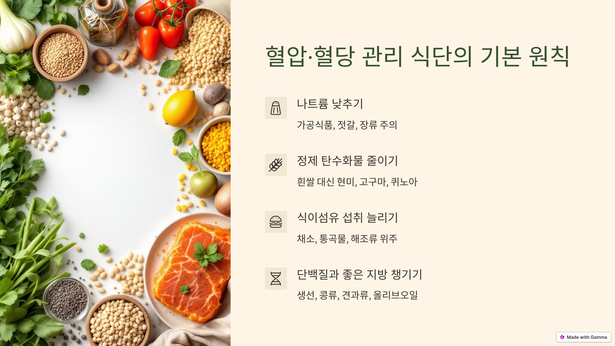 다행히 몇 가지 기본 원칙과 식단 조합법만 알면, 혈압과 혈당 모두 효과적으로 관리할 수 있어요!