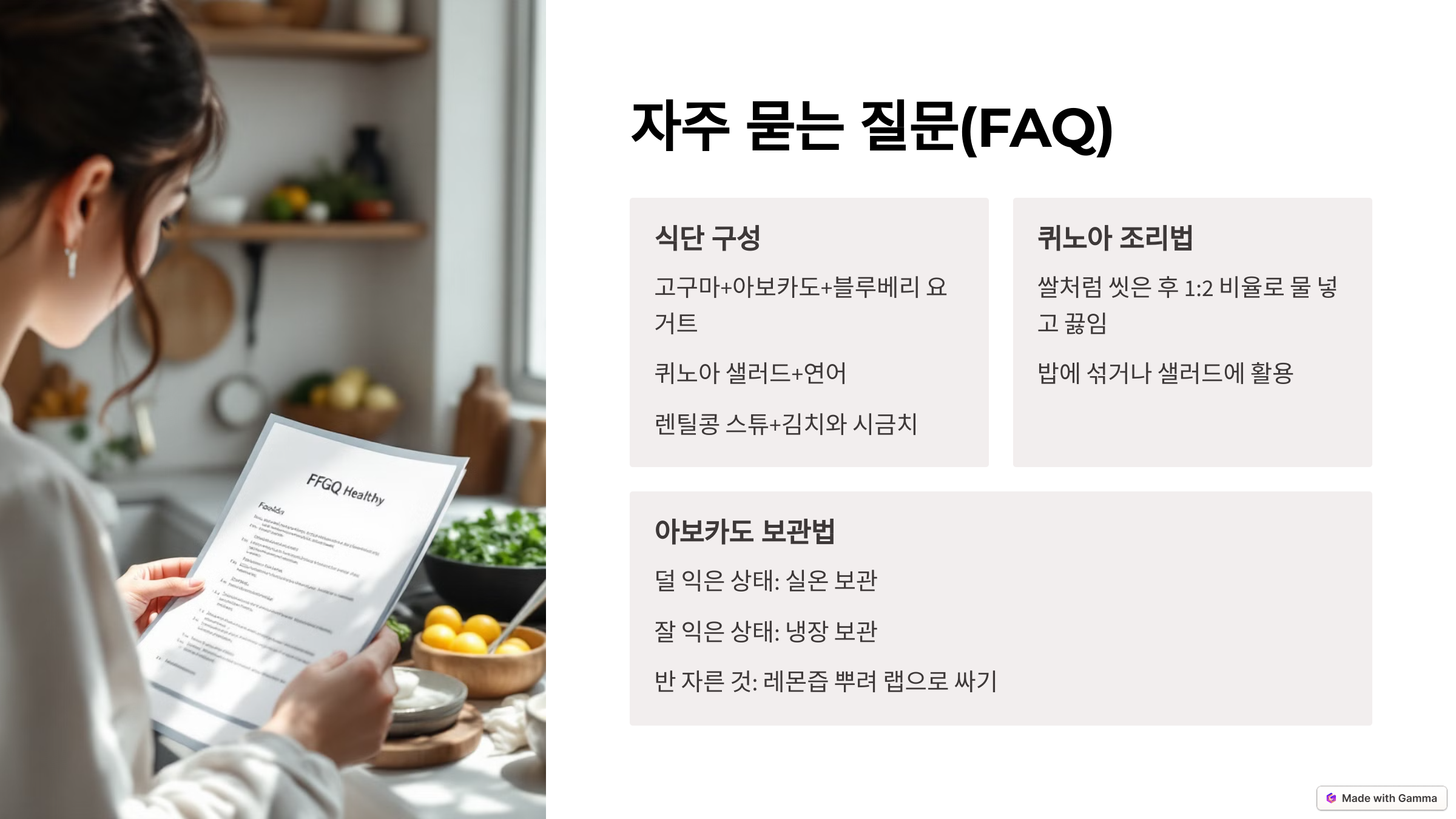 A. 쌀처럼 씻은 후 1:2 비율로 물 넣고 끓이면 돼요. 밥에 섞거나 단독으로 샐러드에 활용 가능해요.