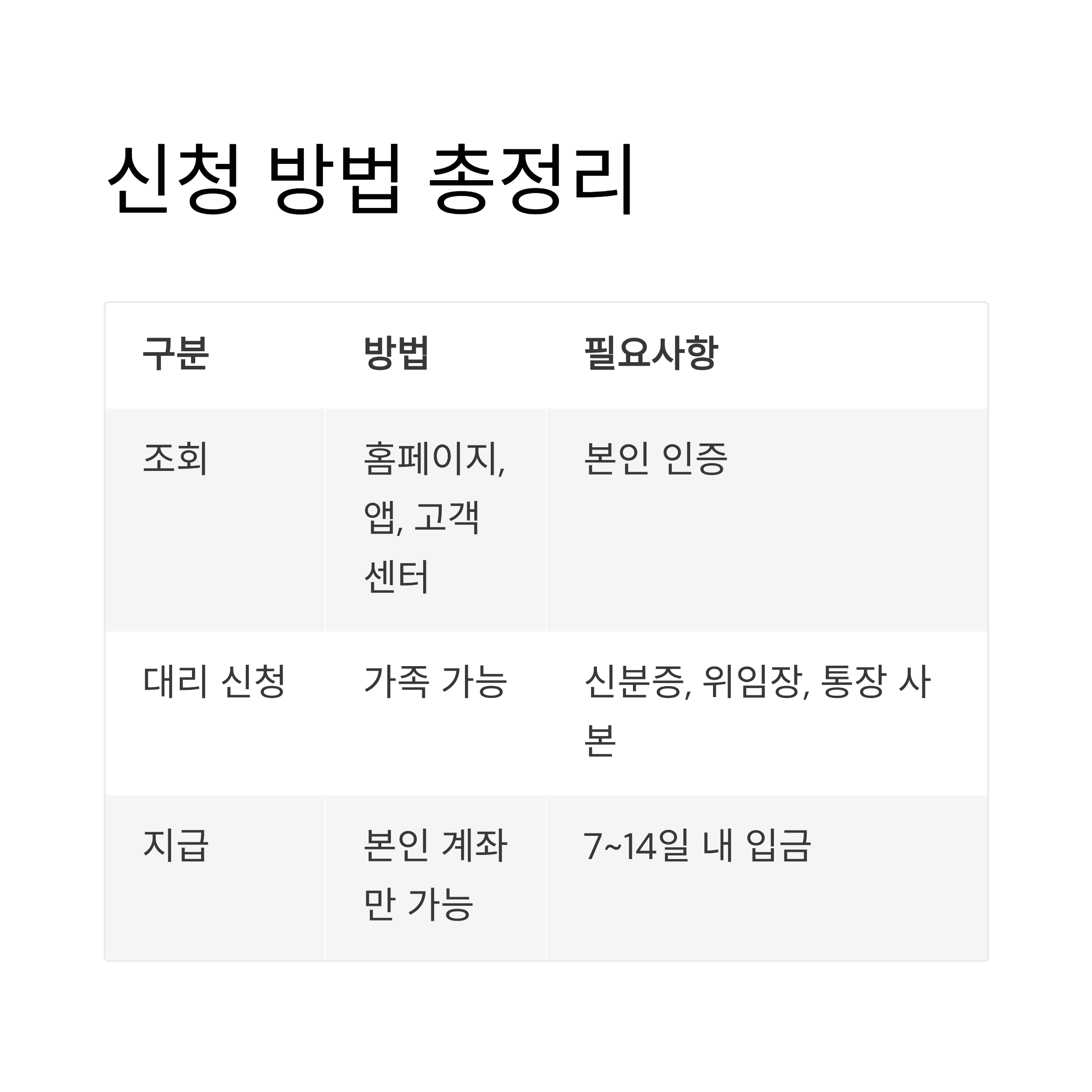 | 대리 신청 | 가족 가능 | 신분증, 위임장, 통장 사본 |