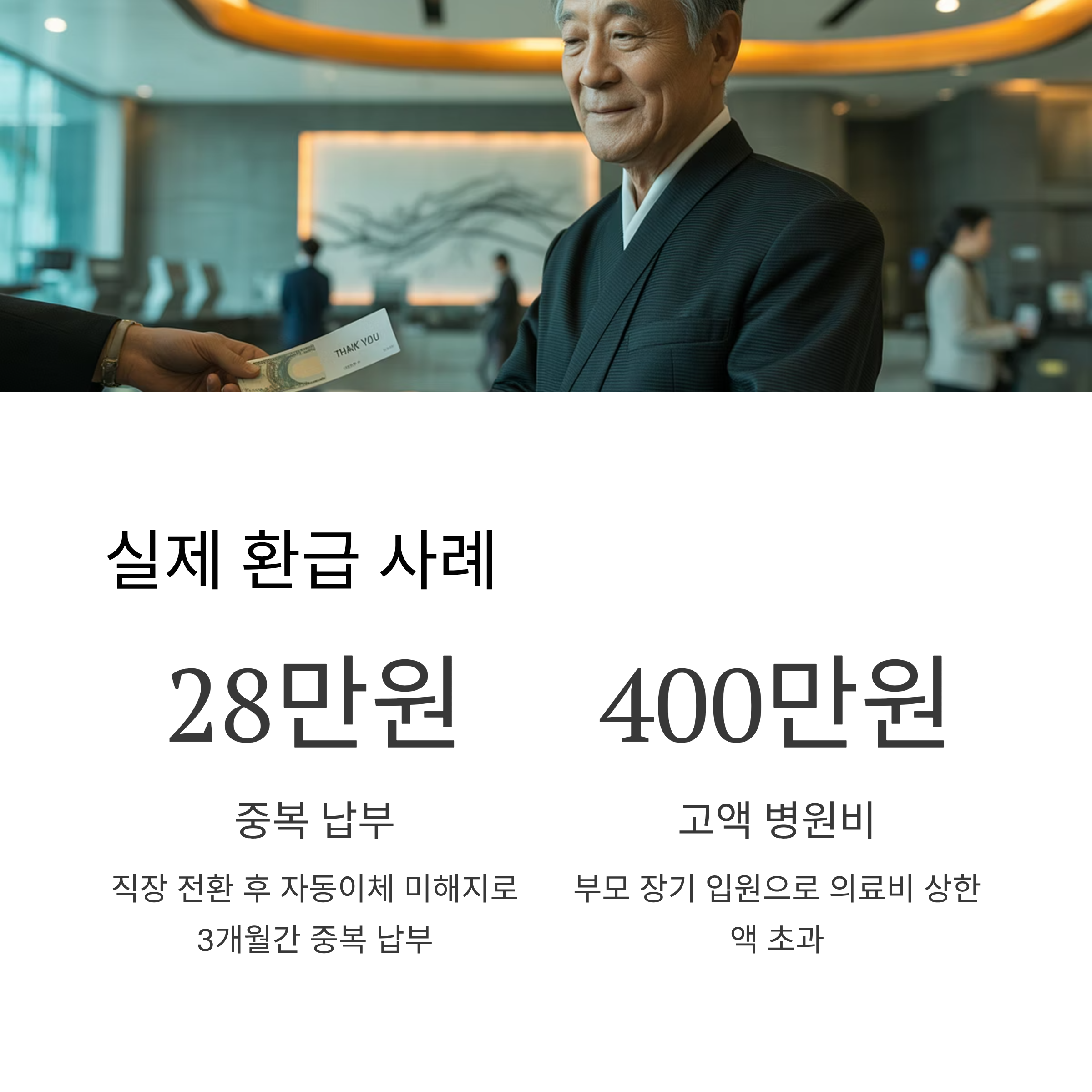 - 중복 납부: 직장 전환 후 자동이체를 해지하지 않아 3개월간 중복 납부 → 약 28만 원 환급
