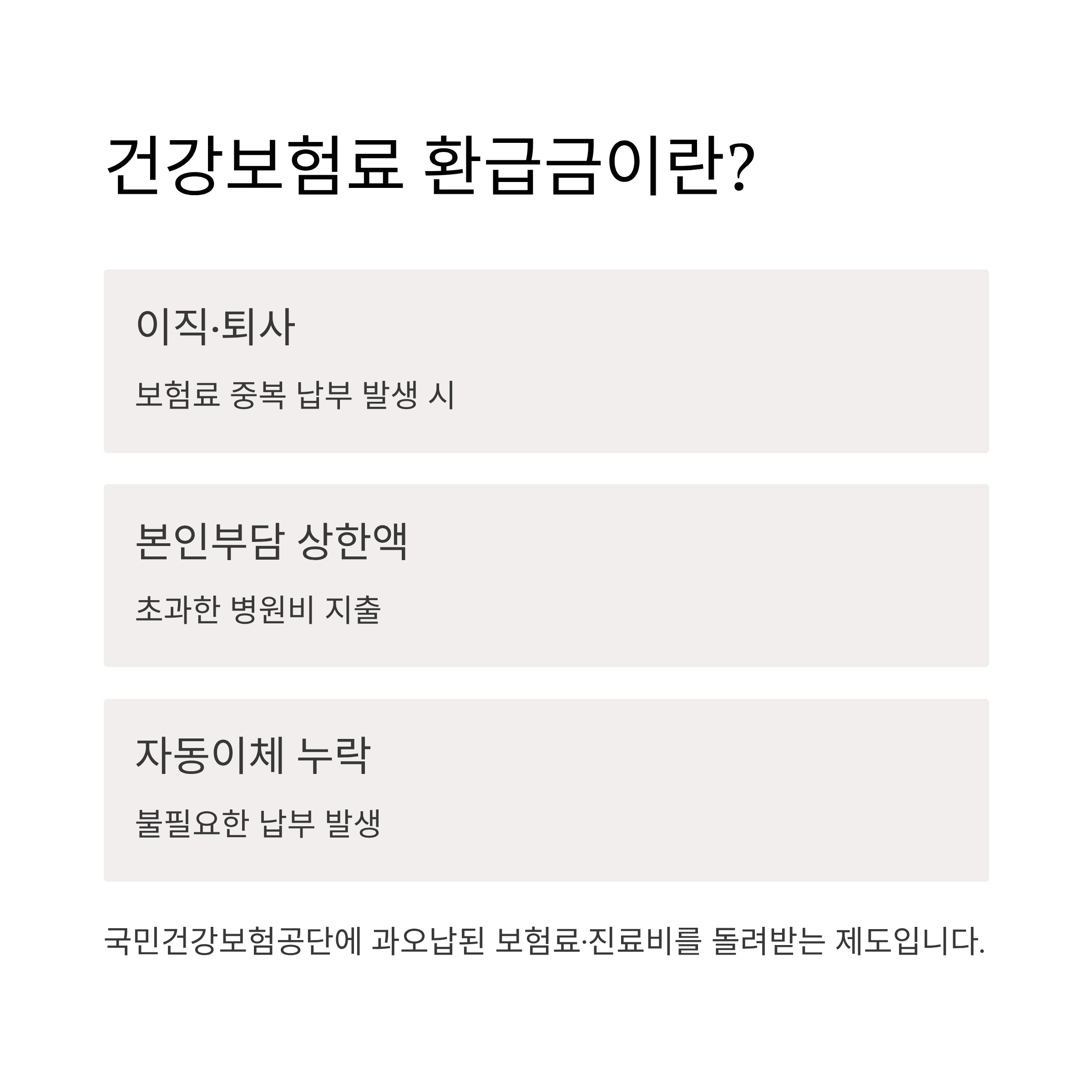 환급금은 국민건강보험공단에 납부된 보험료·진료비 중 과오납된 금액을 돌려주는 제도입니다.