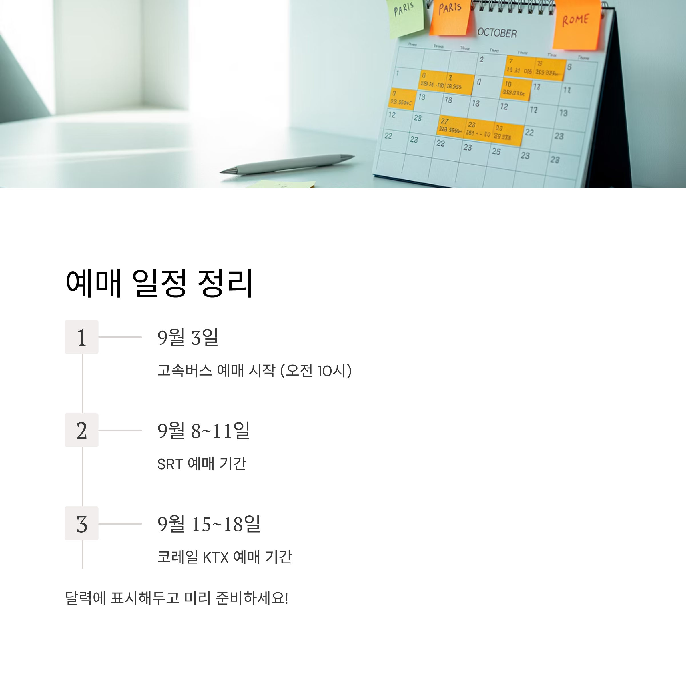 2025 추석 귀성·귀경 교통편 예약은 SRT(9월 8일) → KTX(9월 15일) → 고속버스(9월 3일 개시) 순서로 달력에 표시해두고 준비해야 합니다. 예매 실패 시 취소표 재도전을 통해 원하는 좌석을 확보할 수 있습니다.