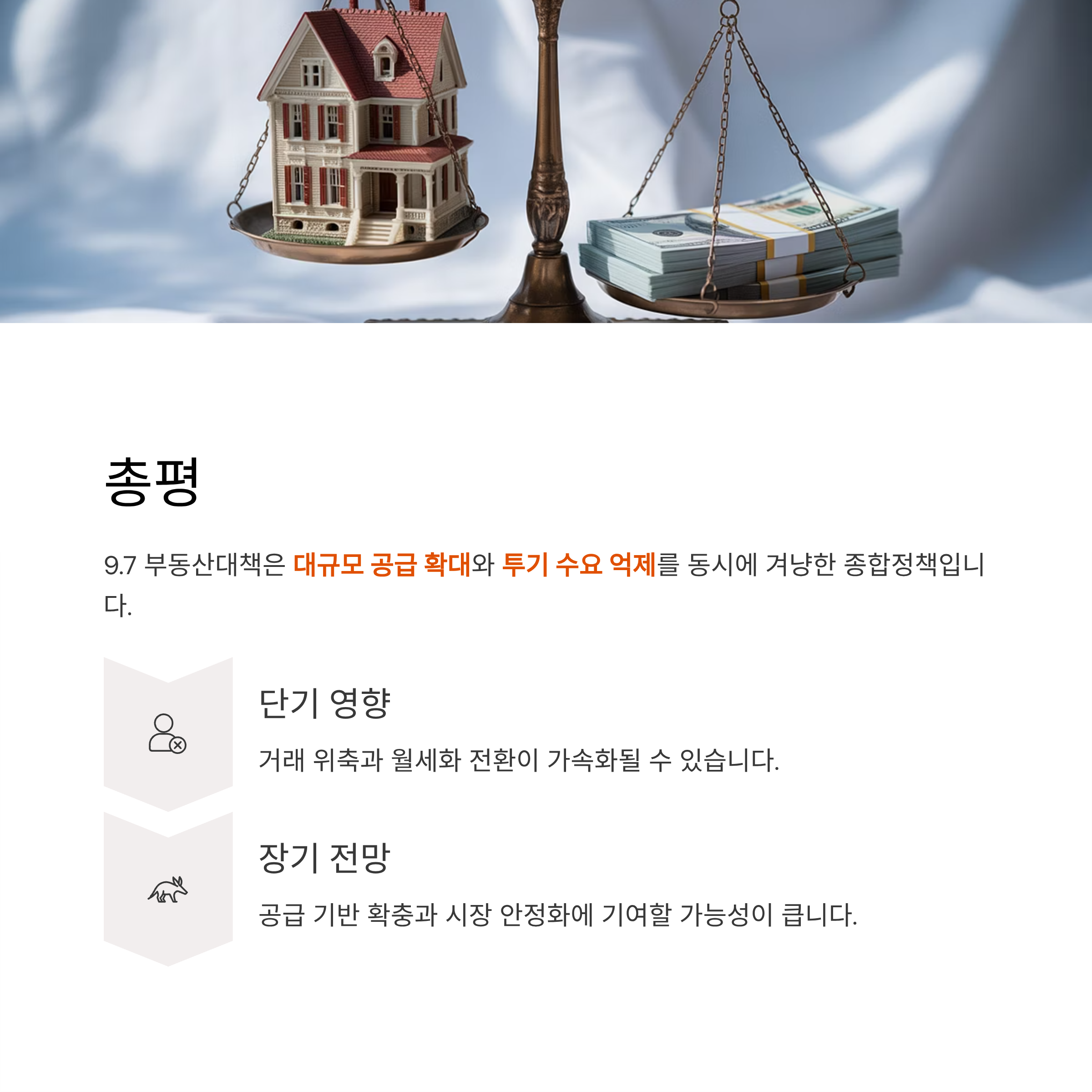 9.7 부동산대책은 대규모 공급 확대와 투기 수요 억제를 동시에 겨냥한 종합정책입니다. 단기적으로는 거래 위축과 월세화 전환이 가속화될 수 있지만, 장기적으로는 공급 기반 확충과 시장 안정화에 기여할 가능성이 큽니다.
