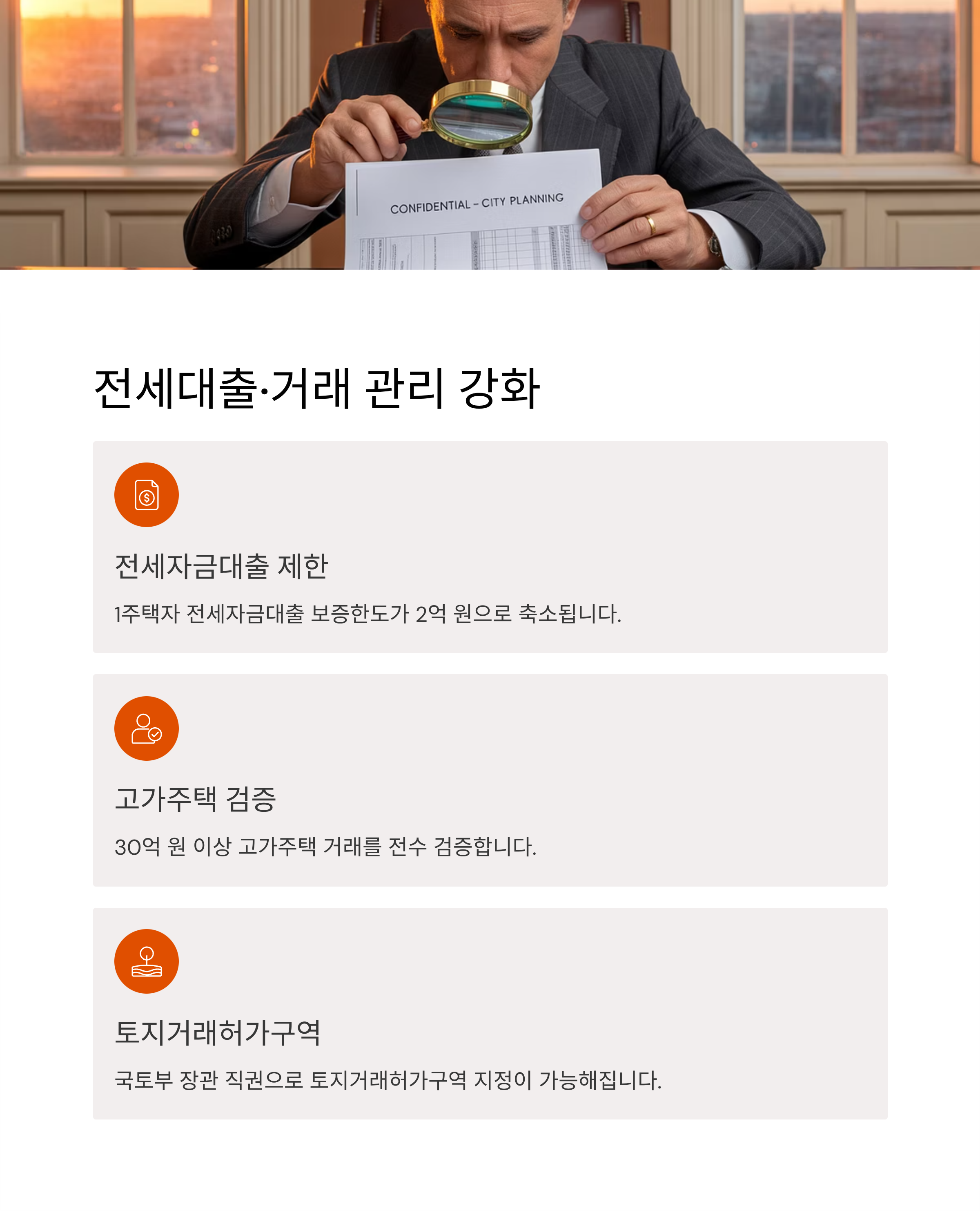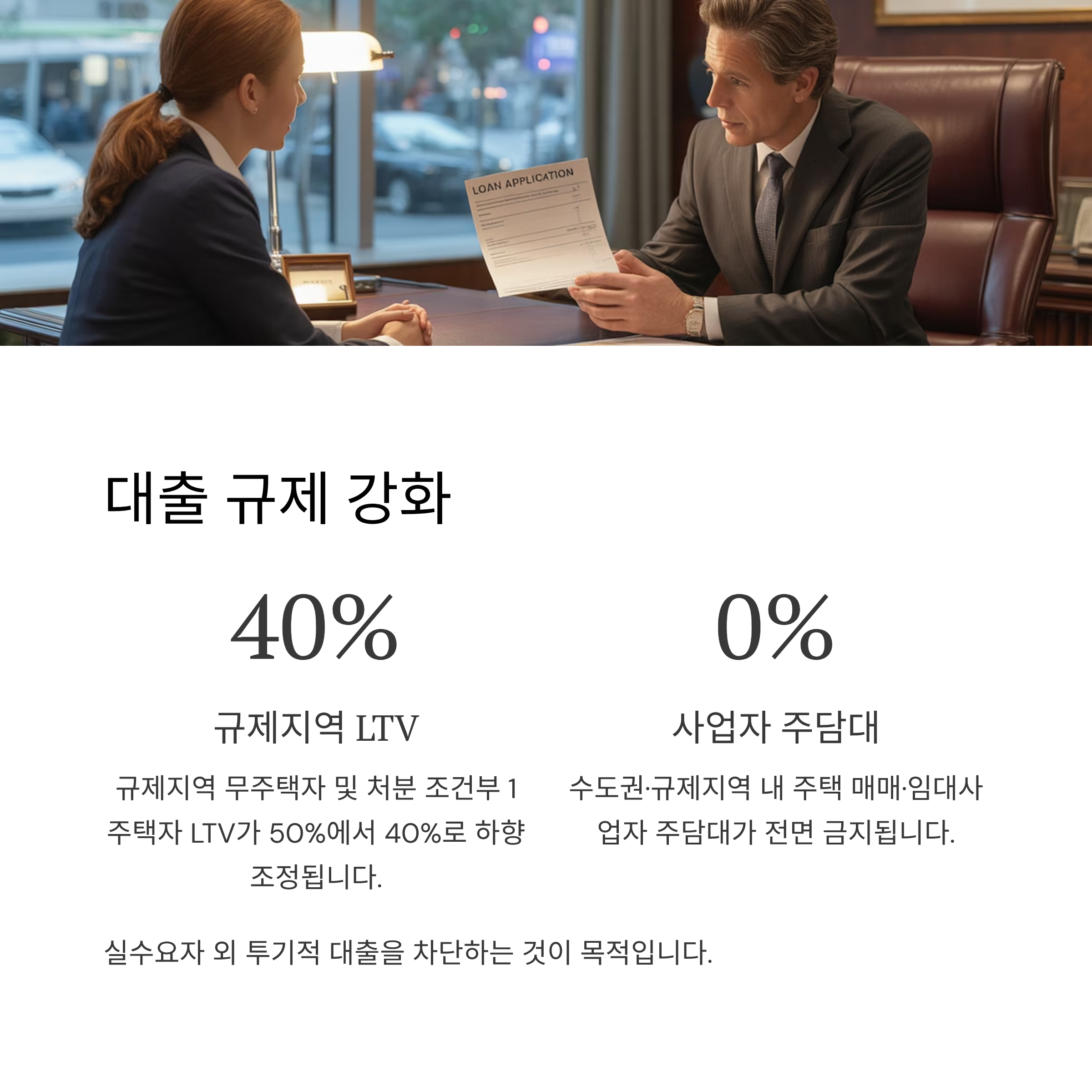 | 대출 규제 | 규제지역 LTV 40%, 매매·임대사업자 0% |