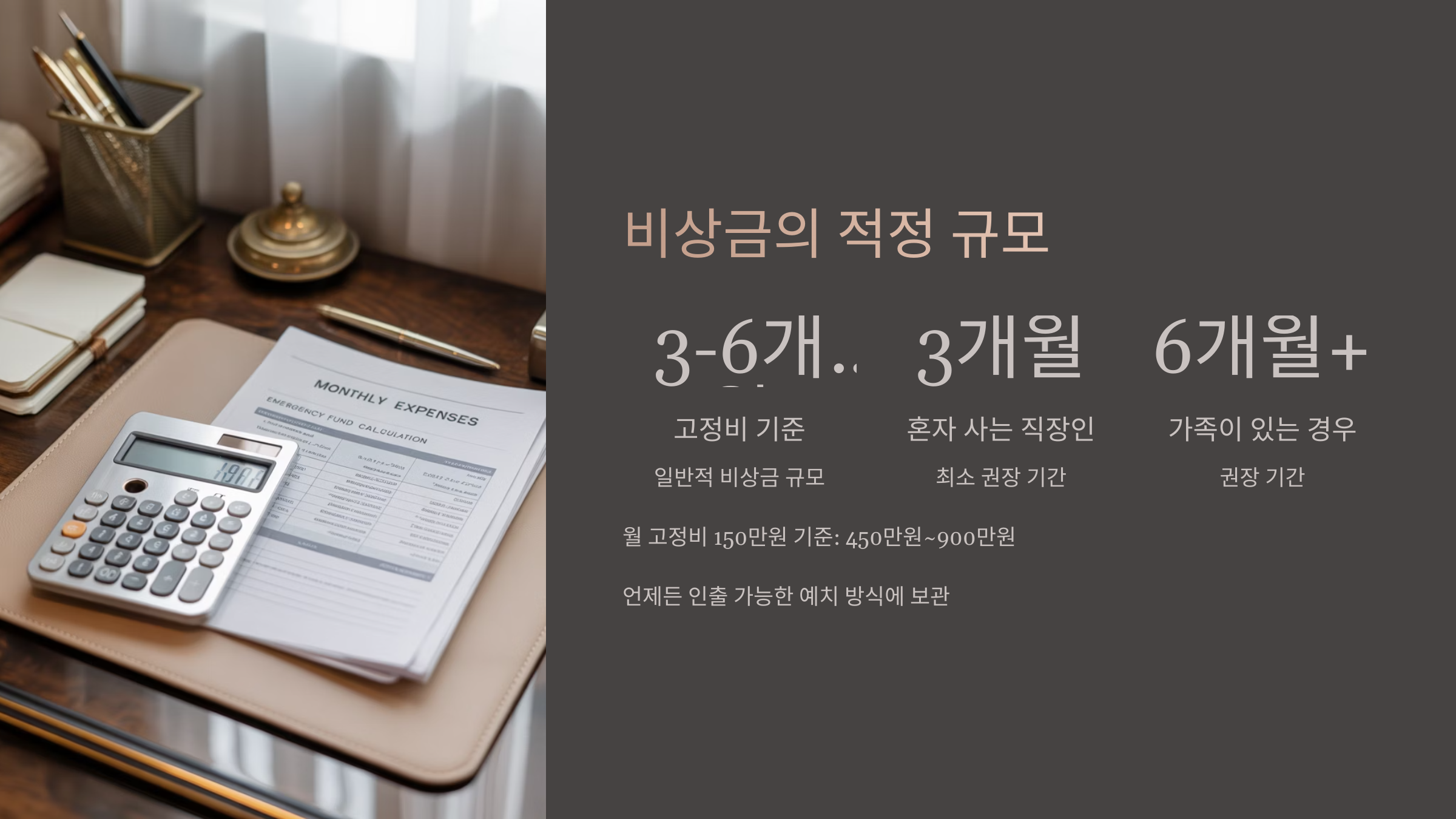 예를 들어 월 고정비가 150만 원이라면, 최소 450만 원에서 900만 원 수준이 적정 비상금입니다. 이 자금은 투자용이 아니라 언제든 인출 가능한 예치 방식(예: CMA 통장, 입출금 통장)에 보관하는 것이 원칙입니다.