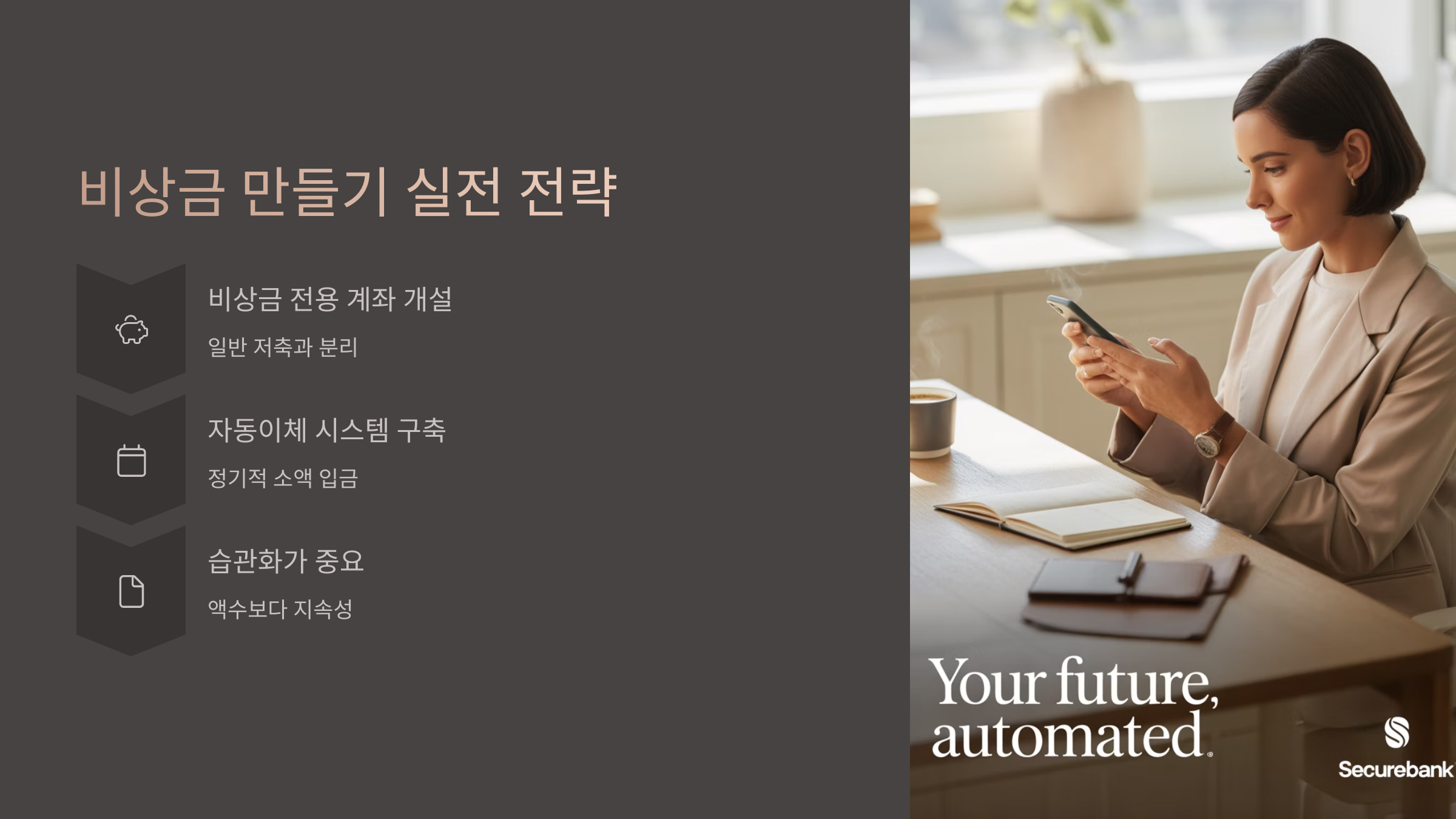 따라서 통장은 분리하고, 이름도 ‘비상금 전용’처럼 명확하게 설정해두는 것이 좋습니다. 비상금은 ‘사용하지 않을 때’를 위한 자산입니다. 자주 들여다보지 않고도 유지할 수 있는 구조를 만드는 것이 핵심입니다.